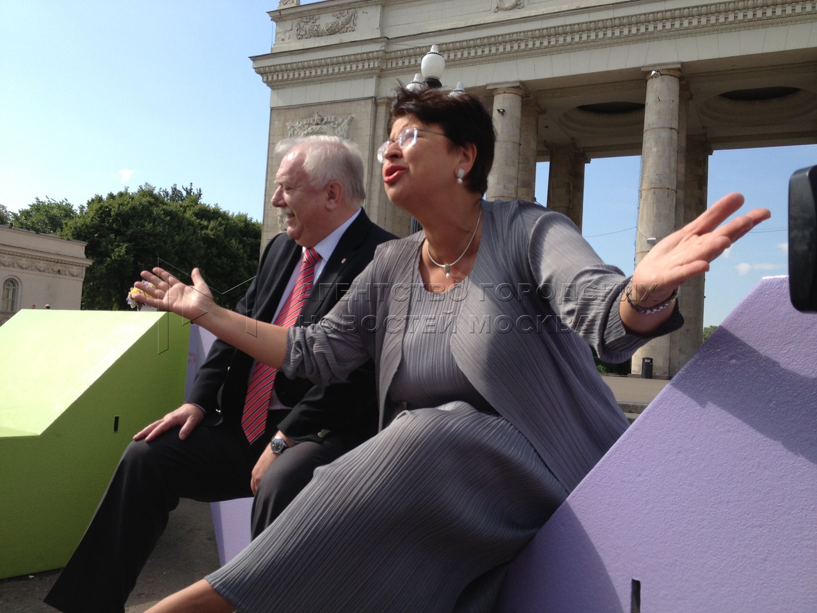 • Описание: Мэр Вены Михаэль Хойпль и глава Венского совета по туризму Рената Браунер во время торжественной церемонии передачи Парку Горького скамеек из Музейного квартала Вены.