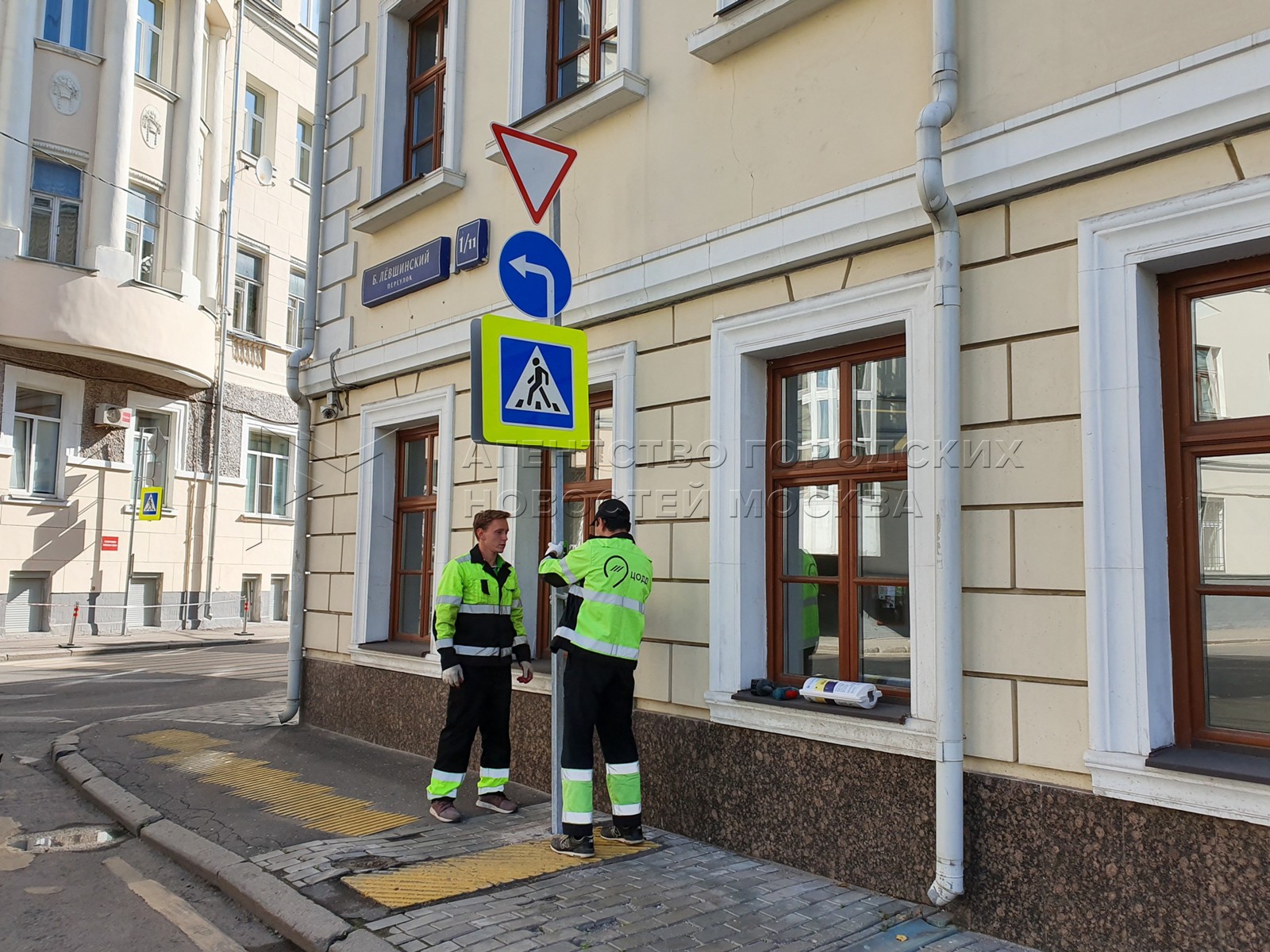 Установка дорожных знаков нового образца в районе Арбат.