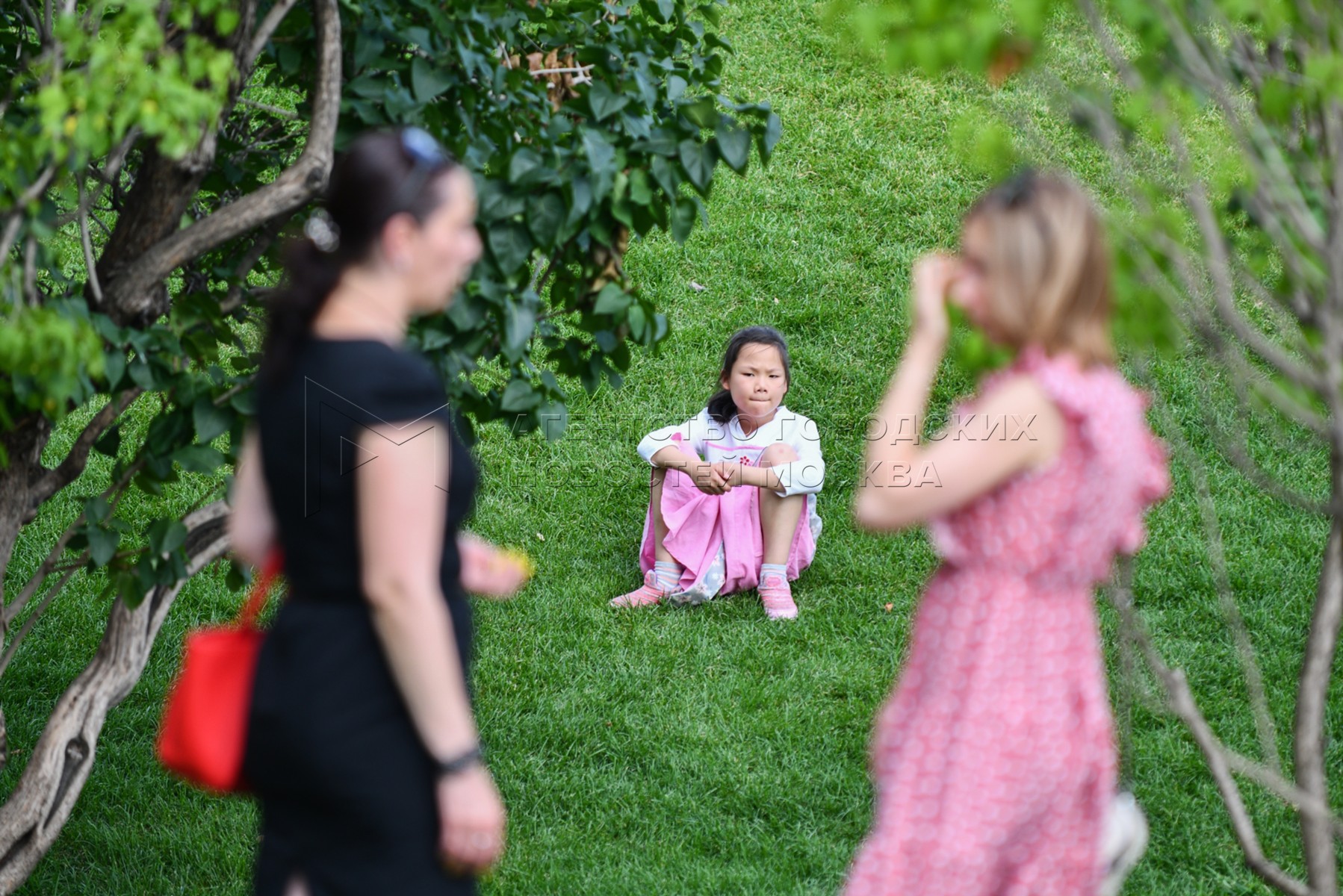 Городские жанры и виды Москвы. Отдых на траве. Юноша и девушка с мобильными телеф...