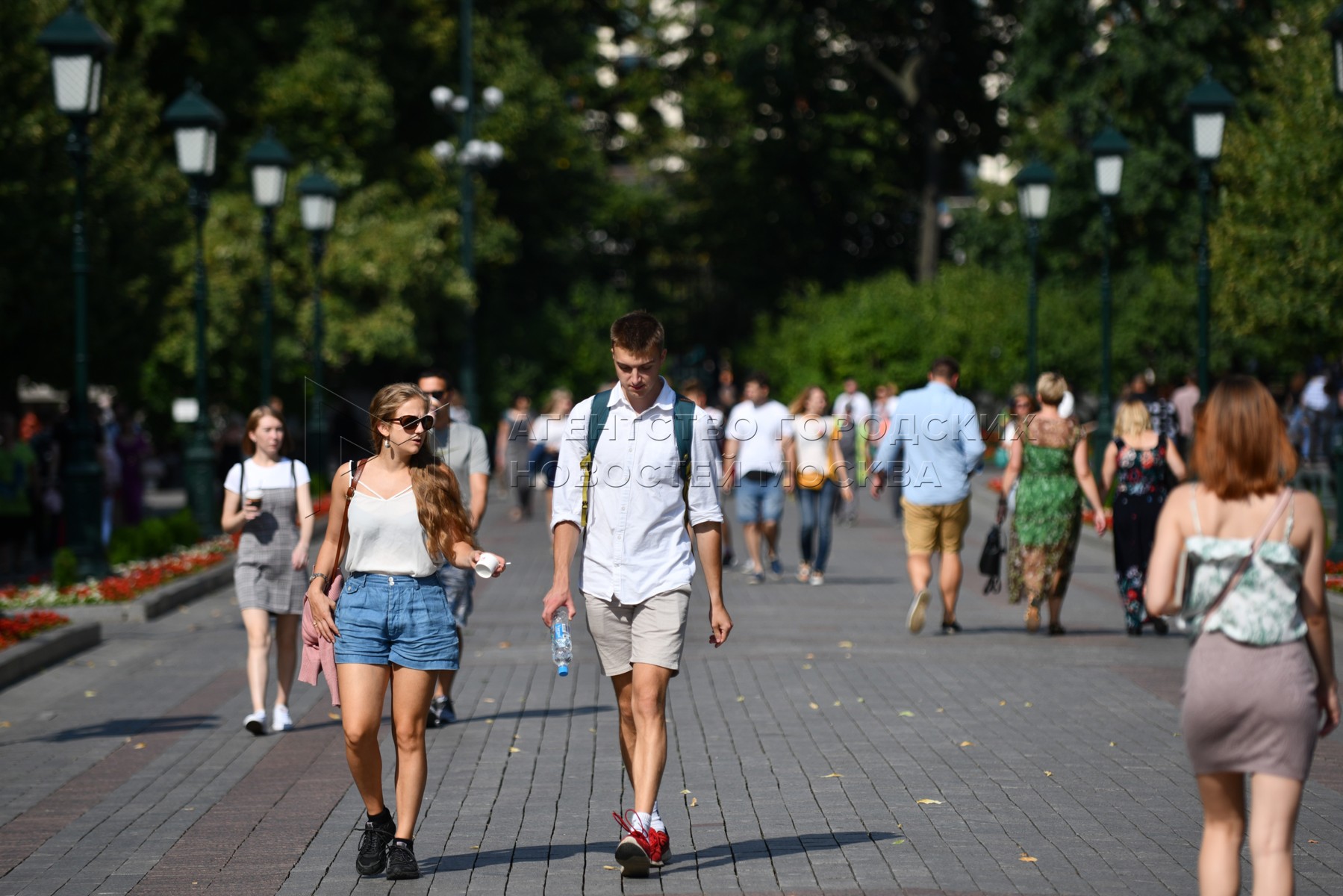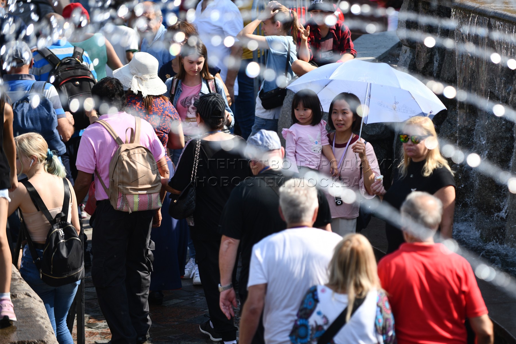 Городские жанры и виды Москвы. Люди возле питьевого фонтанчика на Манежной площад...