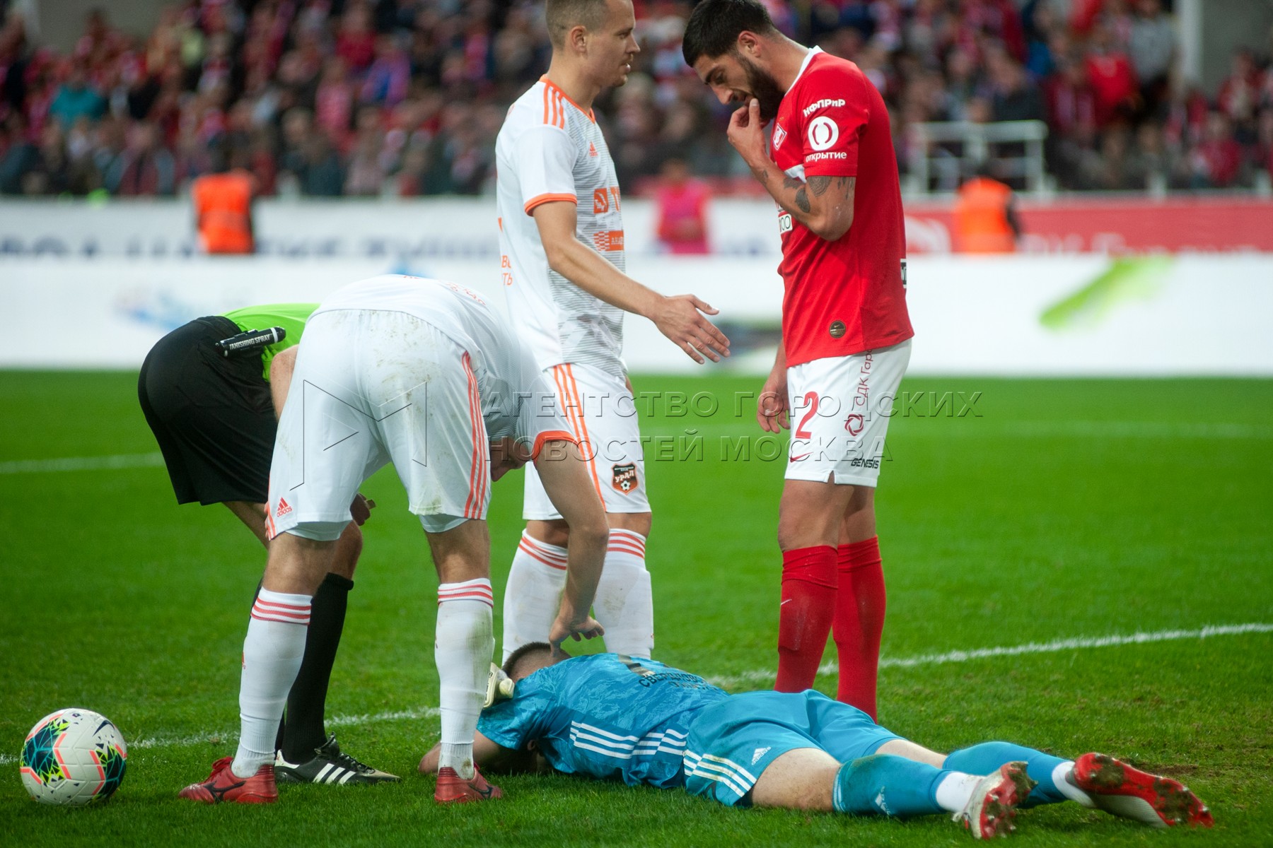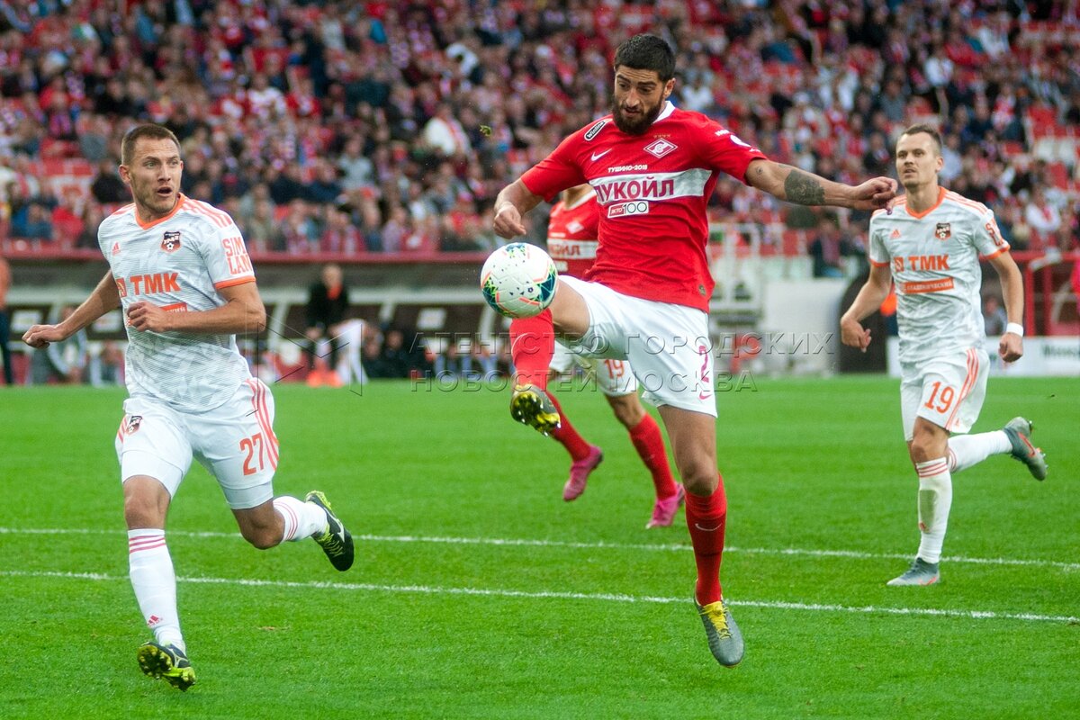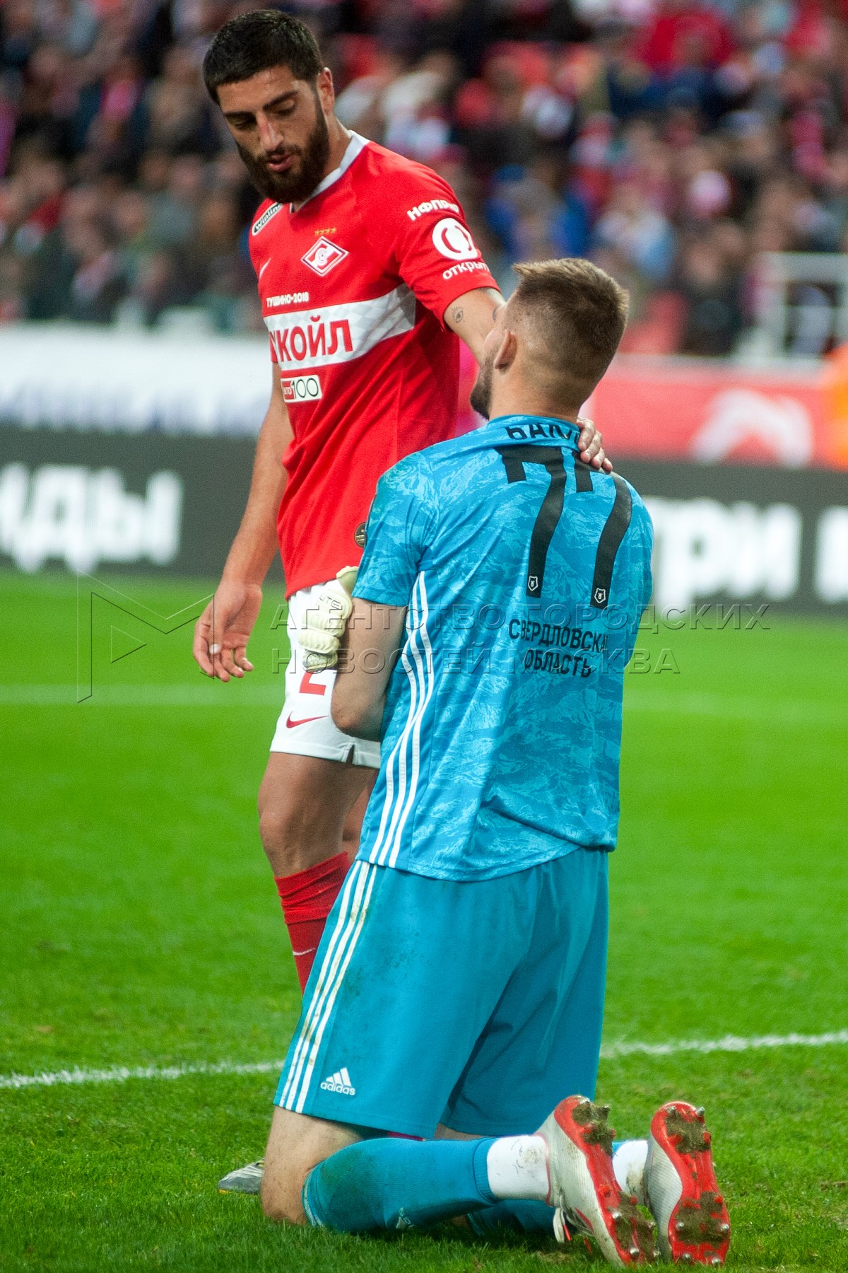 Игрок «Спартака» Алекс Краль (слева) и игрок «Урала» Вараздат Ароян (слева) во вр...