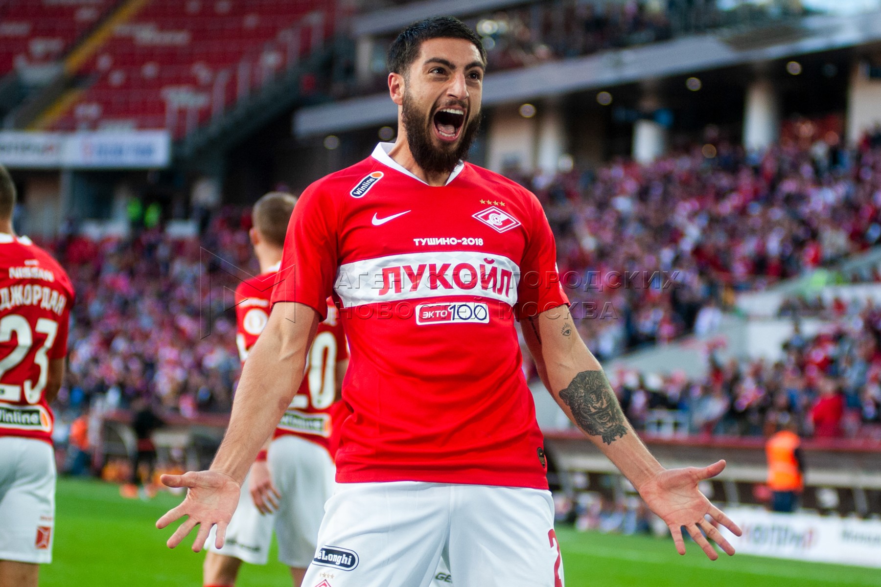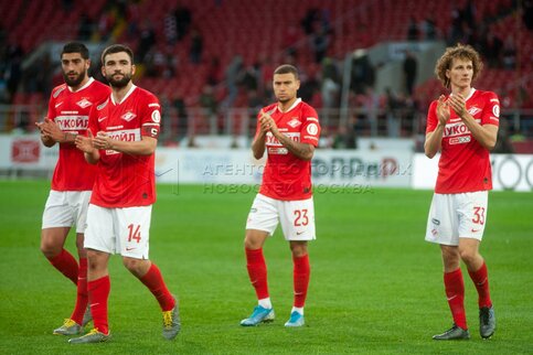 Игроки «Спартака» Ларсон Джордан, Андре Шюррле, Зелимхан Бакаев, Самуэль Жиго (сл...