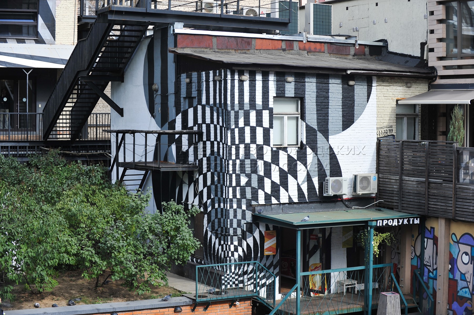 Мурал испанского художника-граффитиста Felipe Pantone на стенах торгово-развлекат...