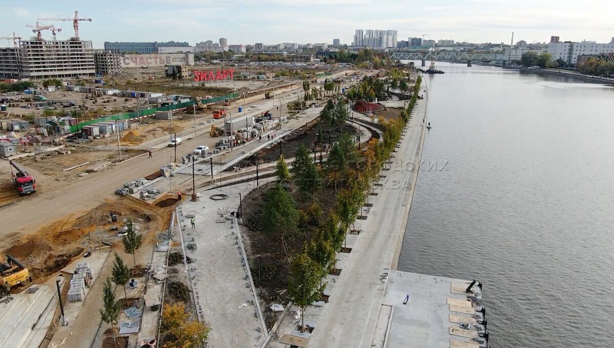 • Описание: Вид с квадрокоптера на работы по благоустройству участка набережной Марка Шагала.