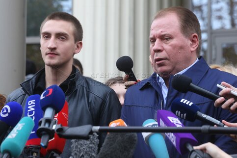 Актер Павел Устинов (слева) и адвокат Анатолий Кучерена (справа) после рассмотрен...