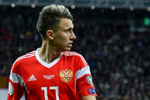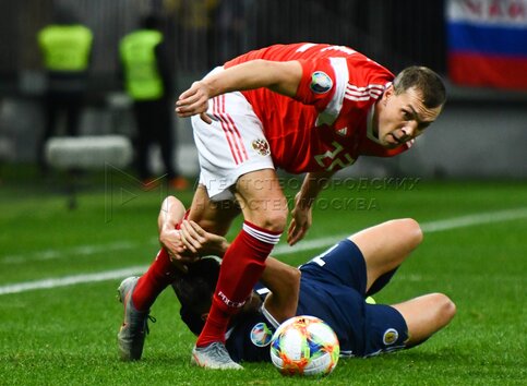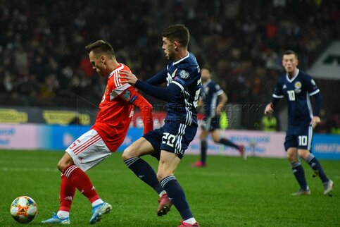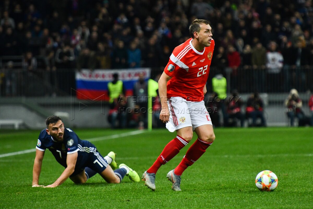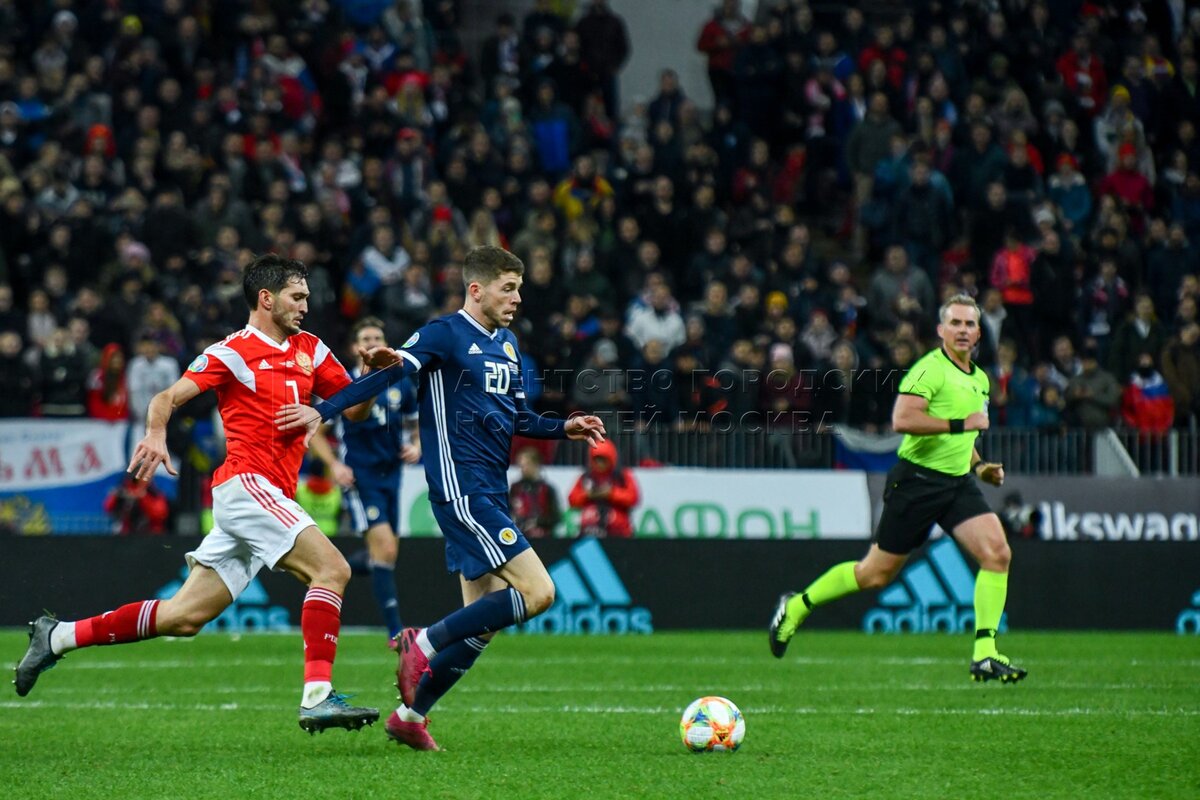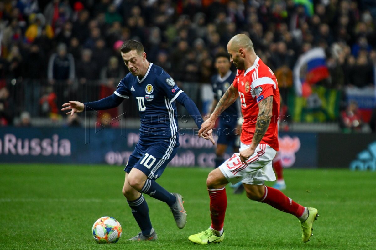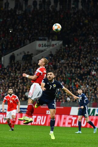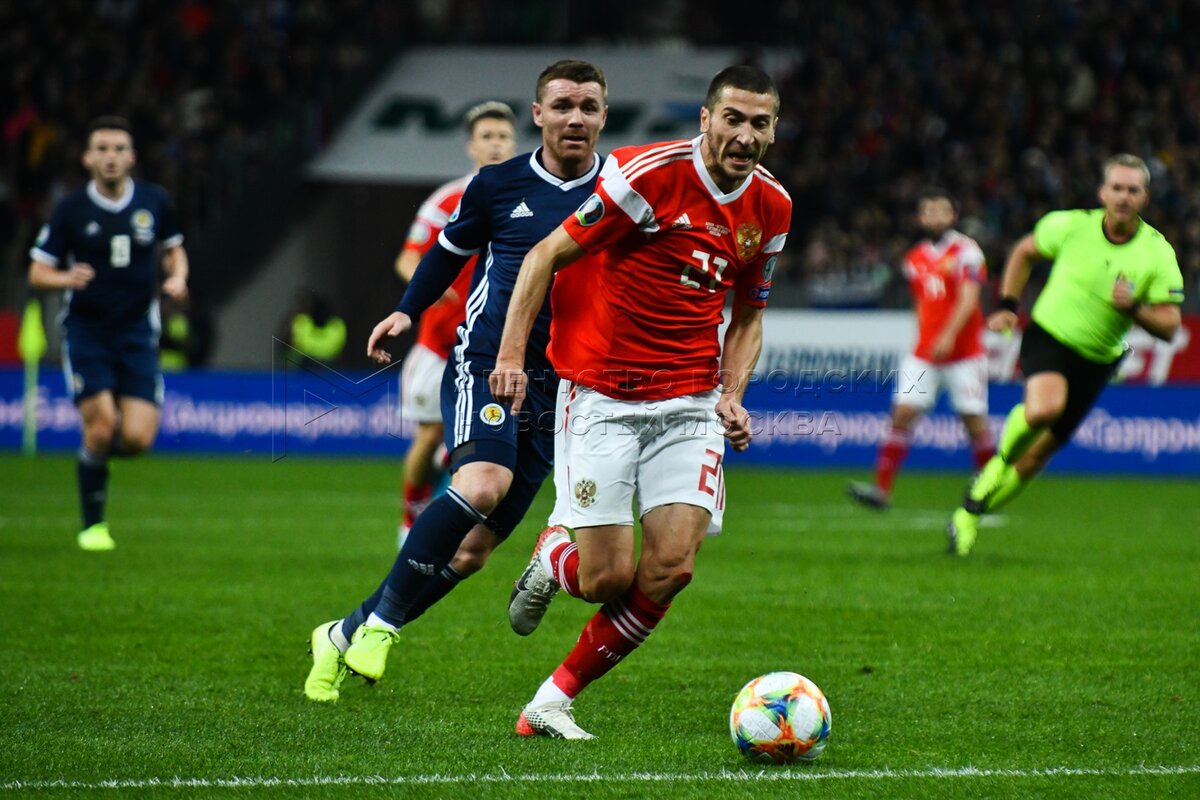 - Описание: Игроки сборной России Артем Дзюба (слева) и сборной Шотландии Чарли Малгрю (справа) в футбольном матче отборочного турнира ЕВРО-2020 между сборными России и Шотландии на стадионе «Лужники».