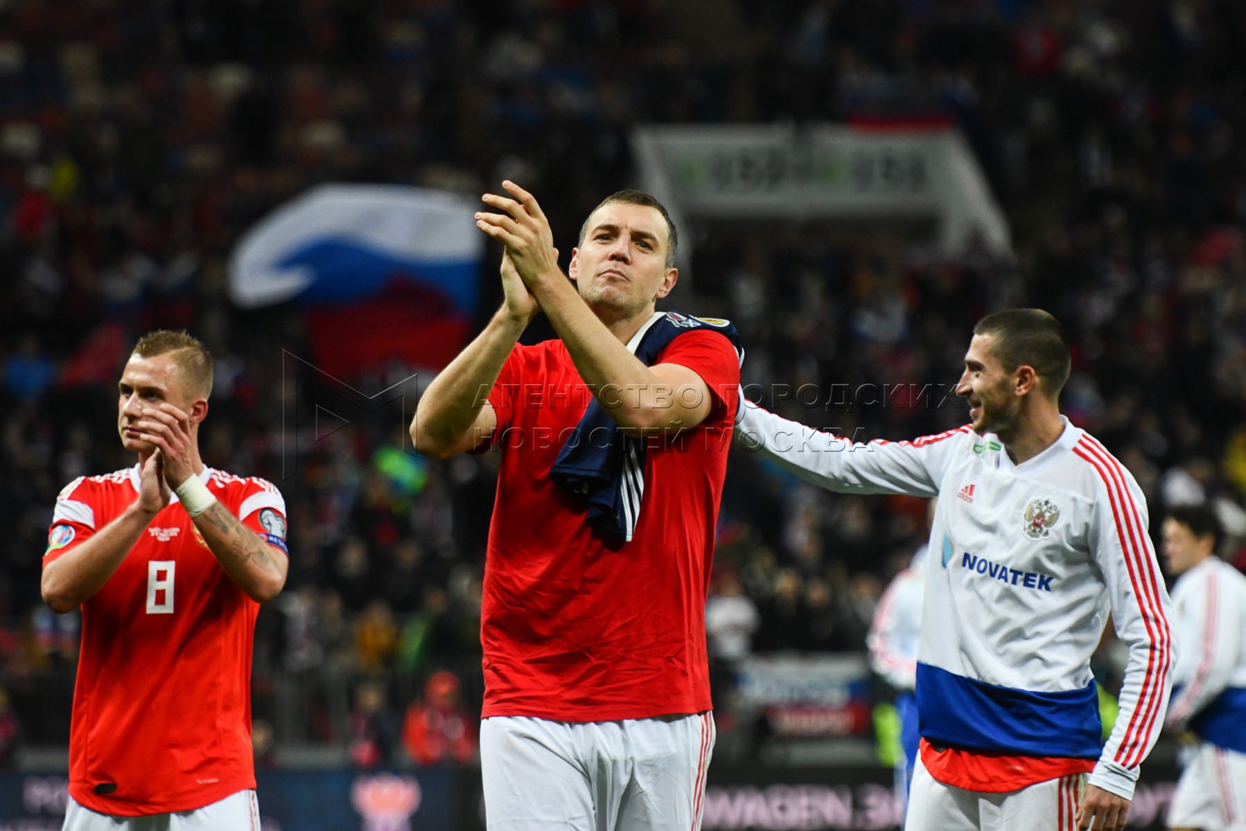 - Описание: Игрок сборной России Артем Дзюба радуется после забитого гола в ворота сборной Шотландии в футбольном матче отборочного турнира ЕВРО-2020 между сборными России и Шотландии на стадионе «Лужники».