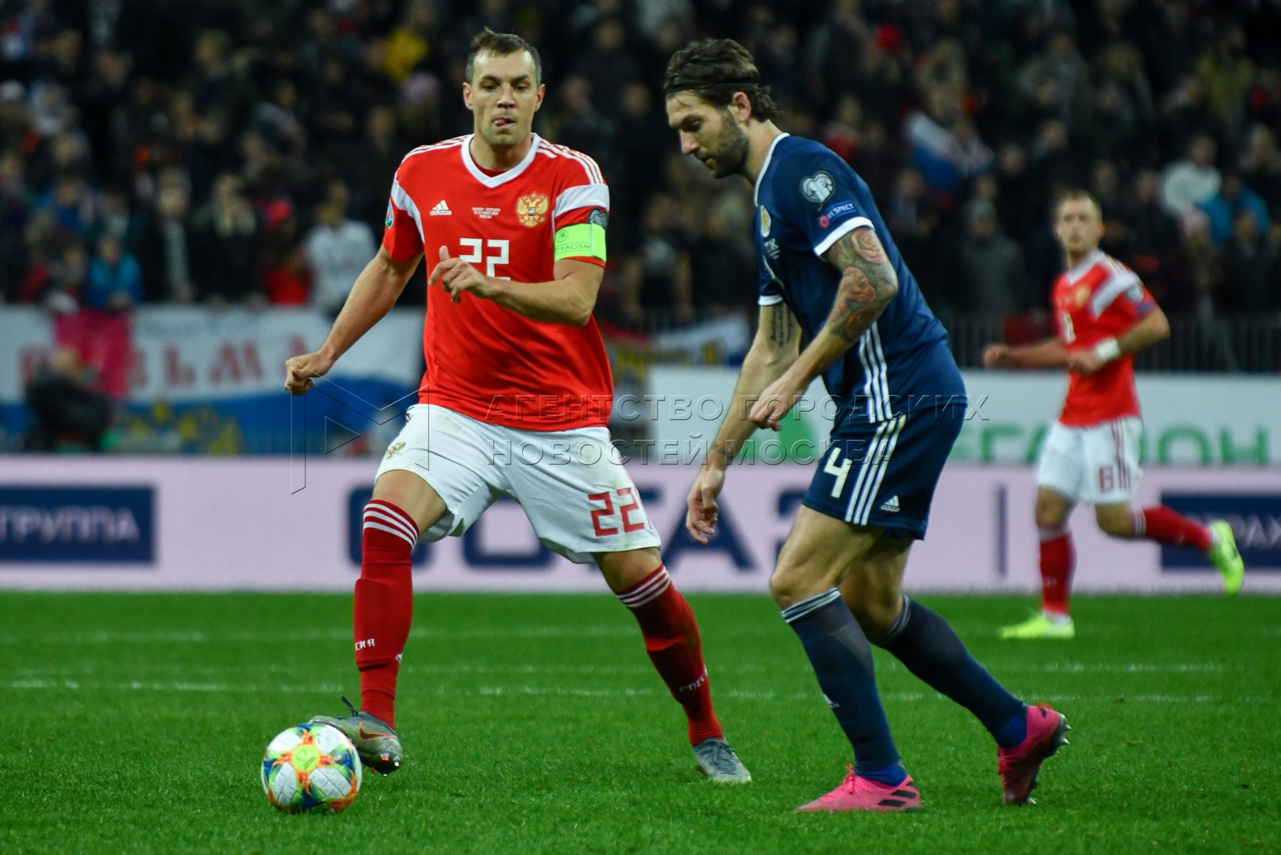 - Описание: Игрок сборной России Артем Дзюба (слева) и игрок сборной Шотландии Чарльз Малгрю в футбольном матче отборочного турнира ЕВРО-2020 между сборными России и Шотландии на стадионе «Лужники».