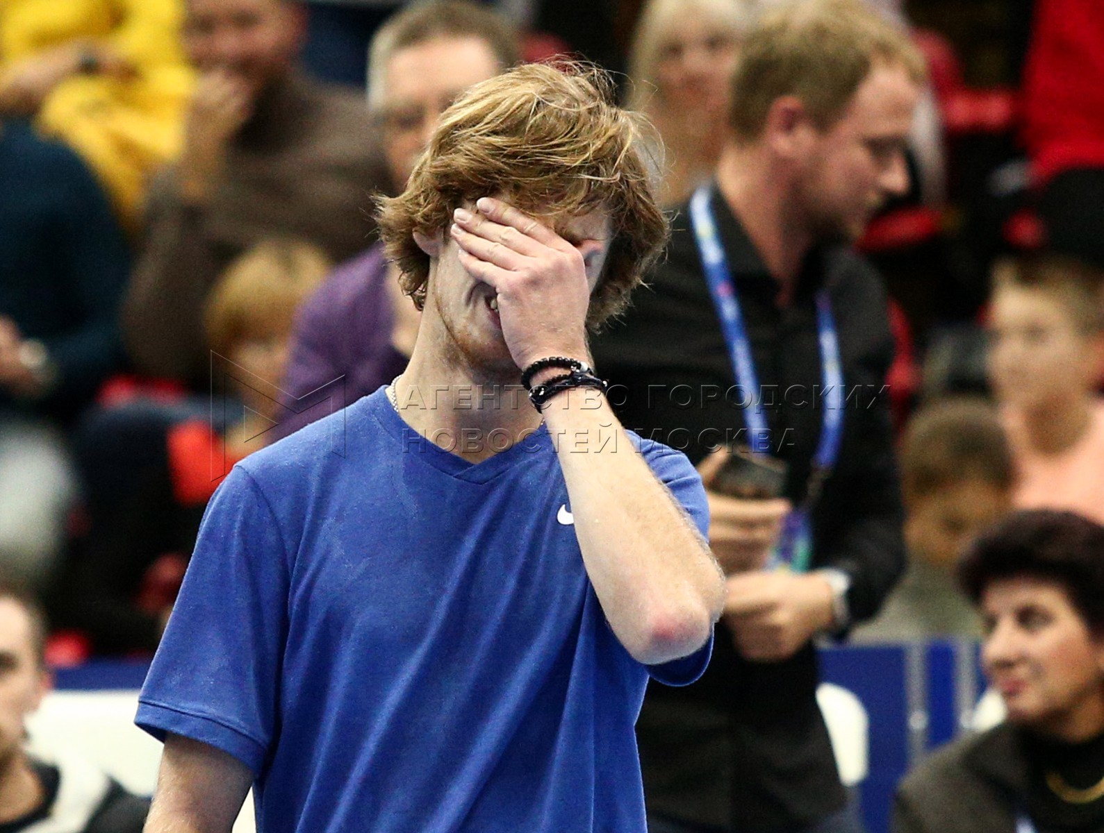 • Описание: Российский теннисист Андрей Рублев во время мужского одиночного финала теннисного турнира «ВТБ Кубок Кремля» в ледовом дворце «Крылатское».