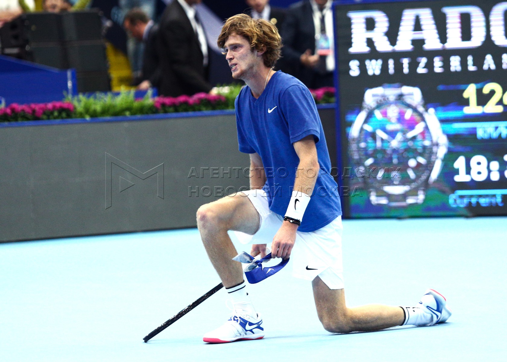 • Описание: Российский теннисист Андрей Рублев во время мужского одиночного финала теннисного турнира «ВТБ Кубок Кремля» в ледовом дворце «Крылатское».