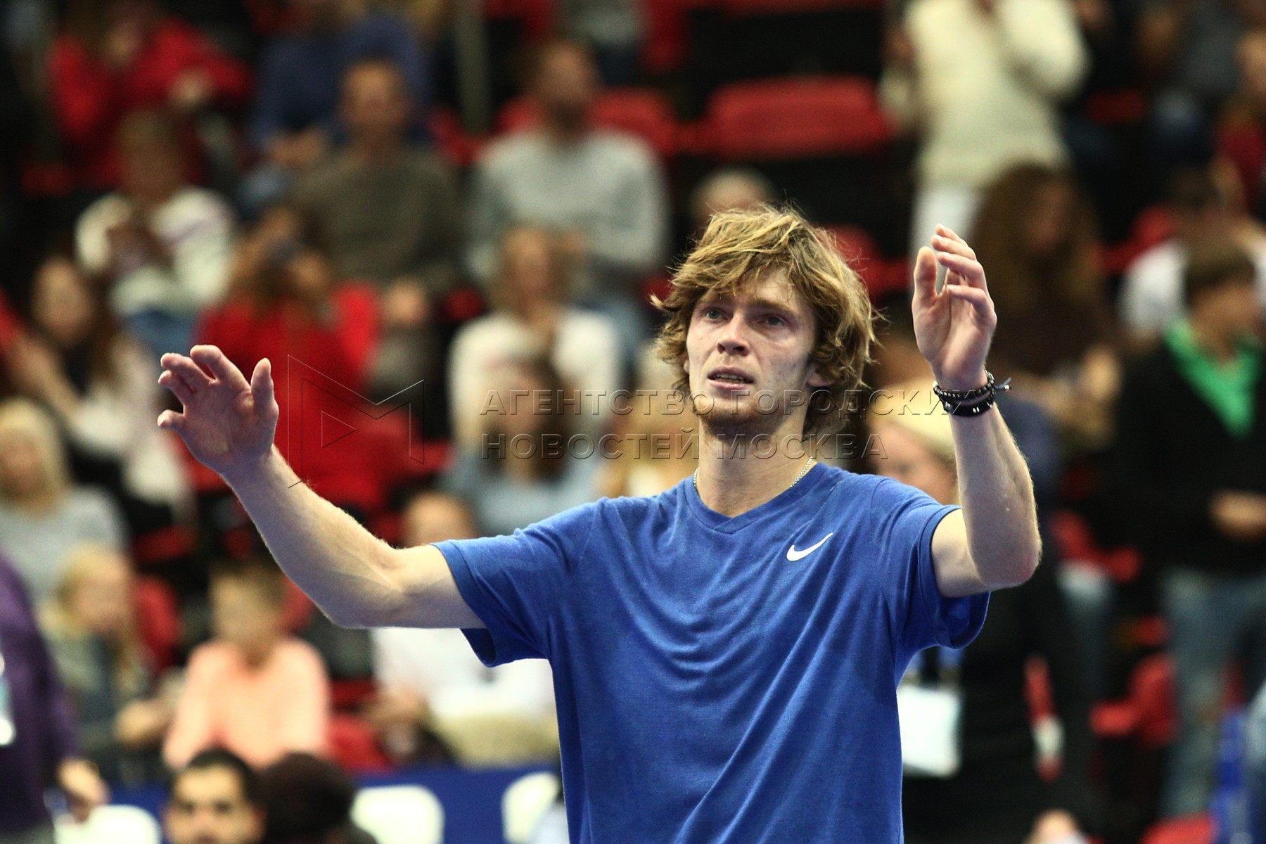 • Описание: Российский теннисист Андрей Рублев во время мужского одиночного финала теннисного турнира «ВТБ Кубок Кремля» в ледовом дворце «Крылатское».