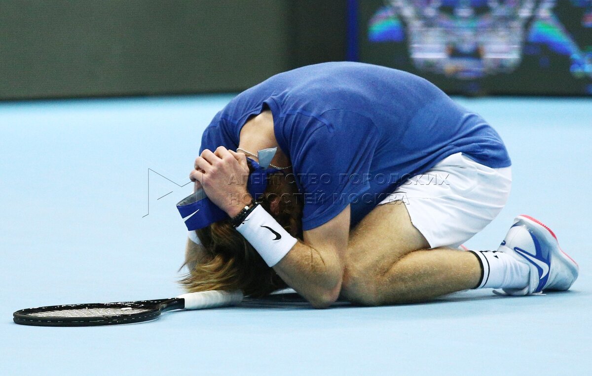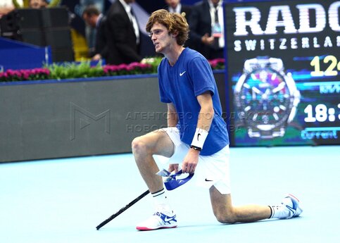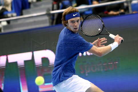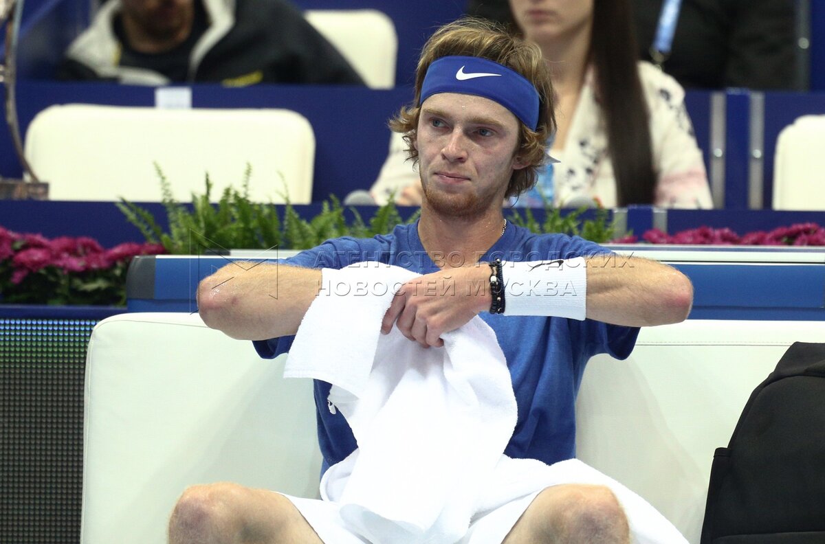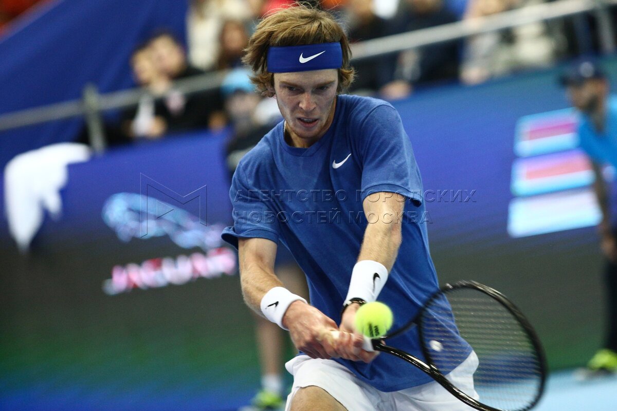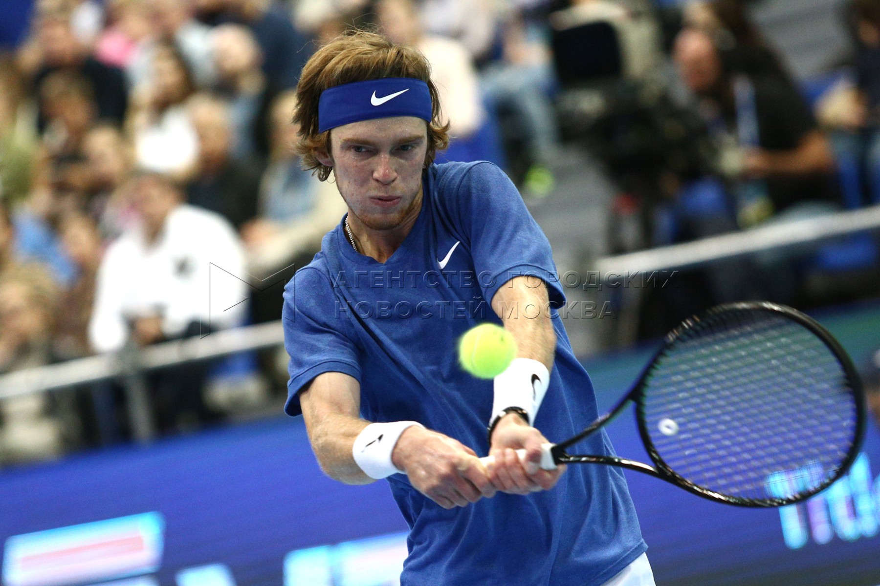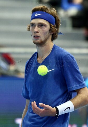 • Описание: Российский теннисист Андрей Рублев во время мужского одиночного финала теннисного турнира «ВТБ Кубок Кремля» в ледовом дворце «Крылатское».