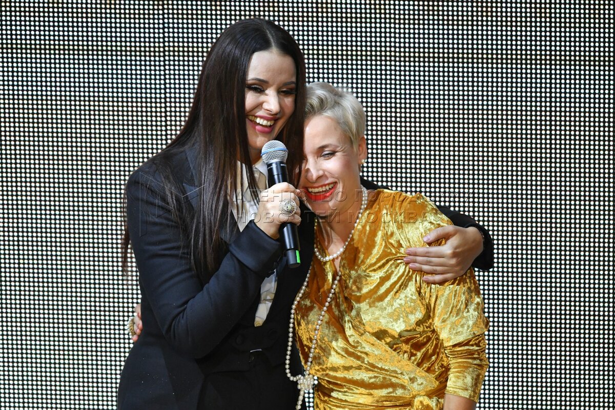 Ведущая церемонии, певица Саша Савельева (слева) и певица Наталья Подольская во в...