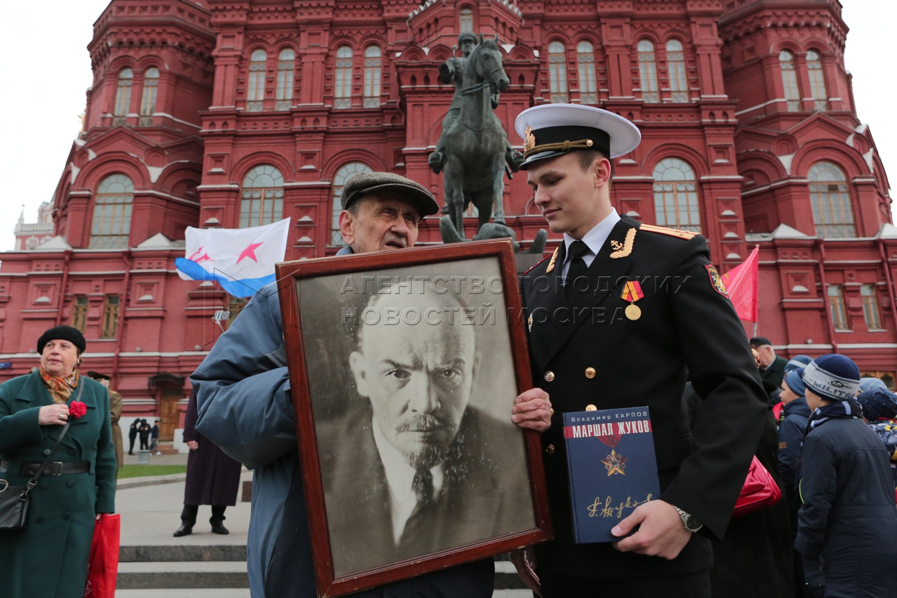- Описание: Участники с портретом В.Ленина перед торжественной церемонией возложения венков и цветов к Мавзолею Владимира Ленина на Красной площади перед Историческим музеем.