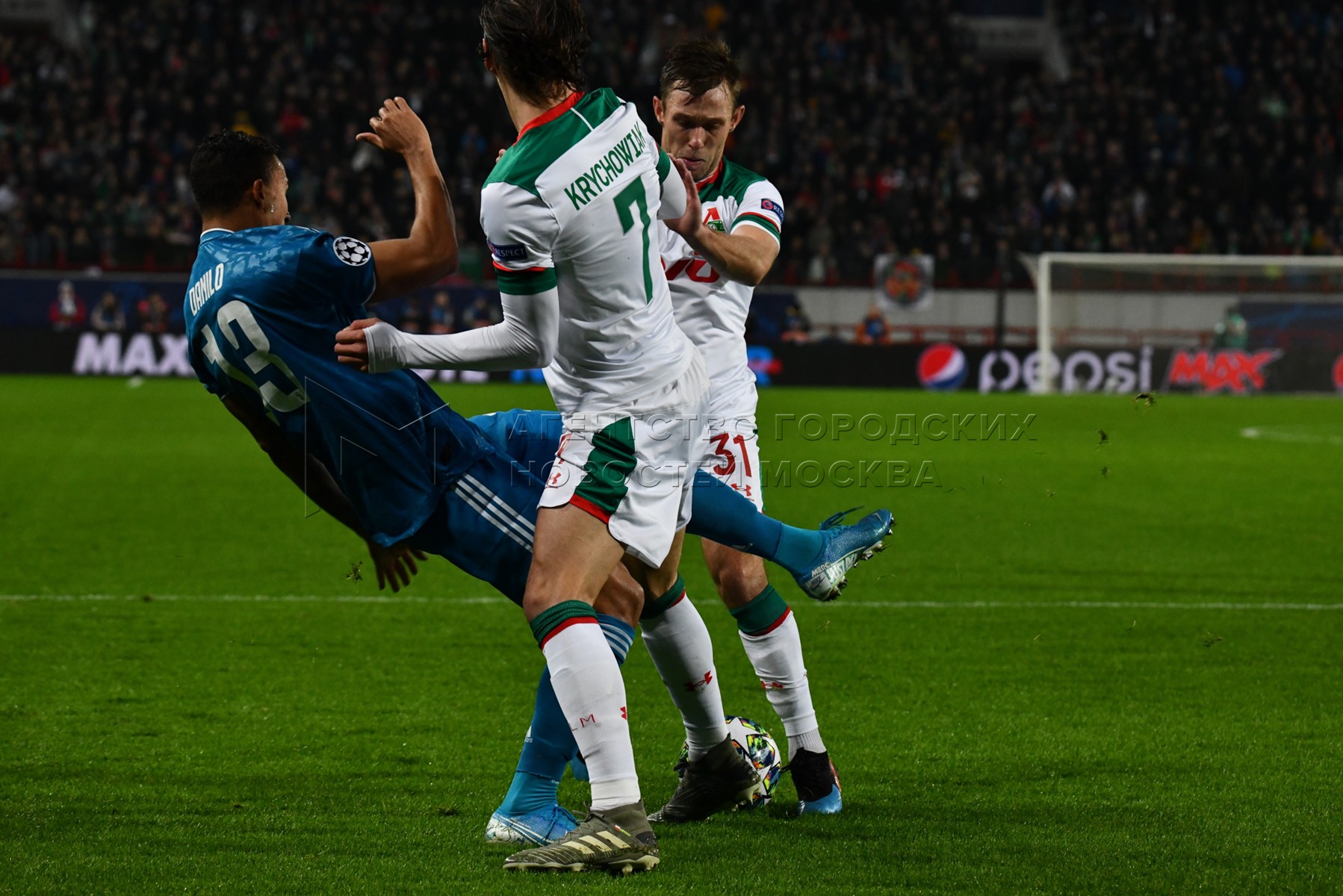 Игроки «Ювентуса» Данило и «Локомотива» Гжегож Крыховяк, Мацей Рыбусь (слева напр...
