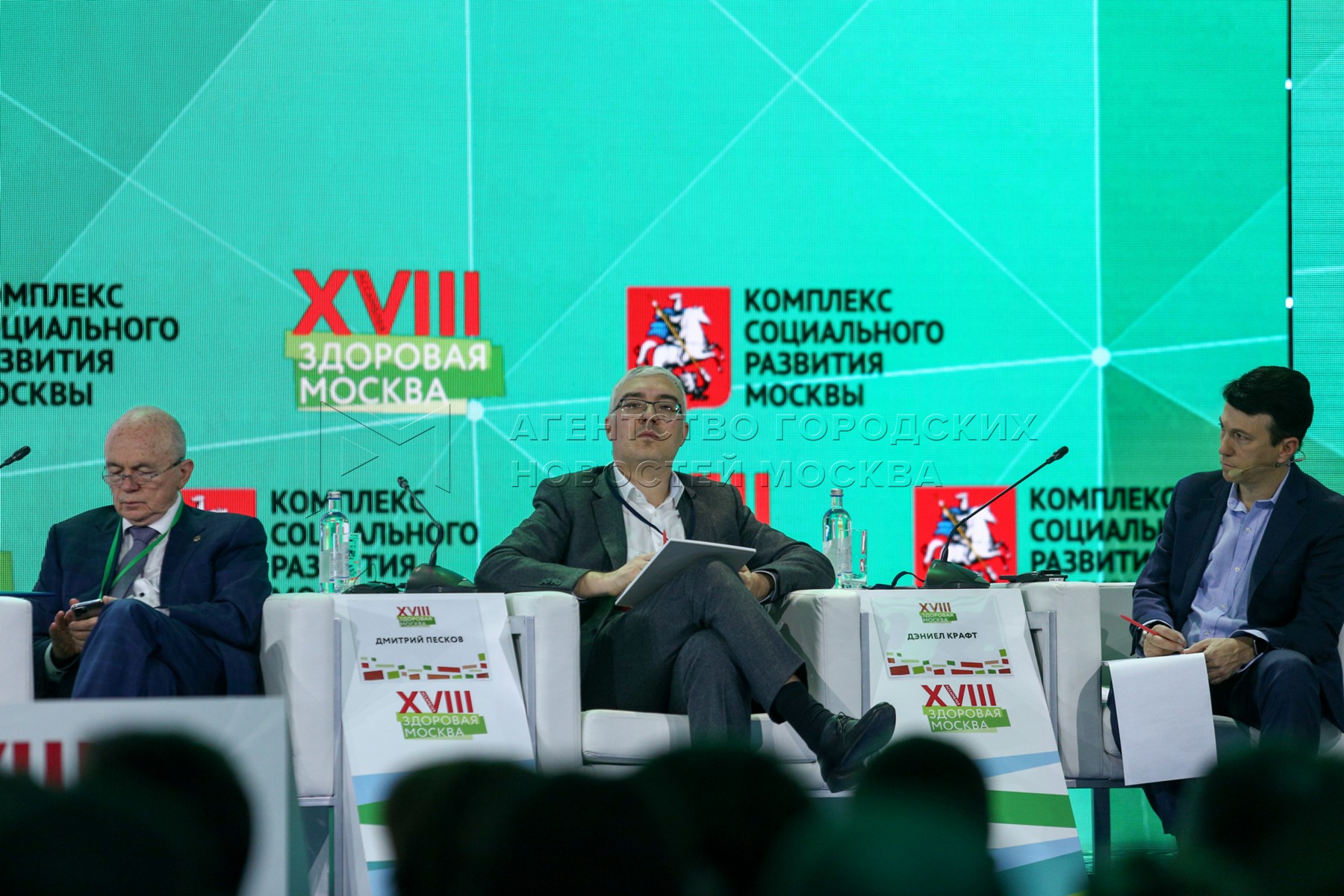 - Описание: Президент многопрофильной частной клиники АО «Медицина» Григорий Ройтберг, специальный представитель президента РФ по вопросам цифрового и технологического развития Дмитрий Песков и декан медицинского факультета в Университете Сингулярности, основатель и руководитель программы «Экспоненциальная медицина» Дэниел Крафт (слева направо) во время пленарного заседания «Цифровизация здравоохранения. Новые возможности для врачей, пациентов, системы здравоохранения на втором дне работы ассамблеи «Здоровая Москва» на ВДНХ.