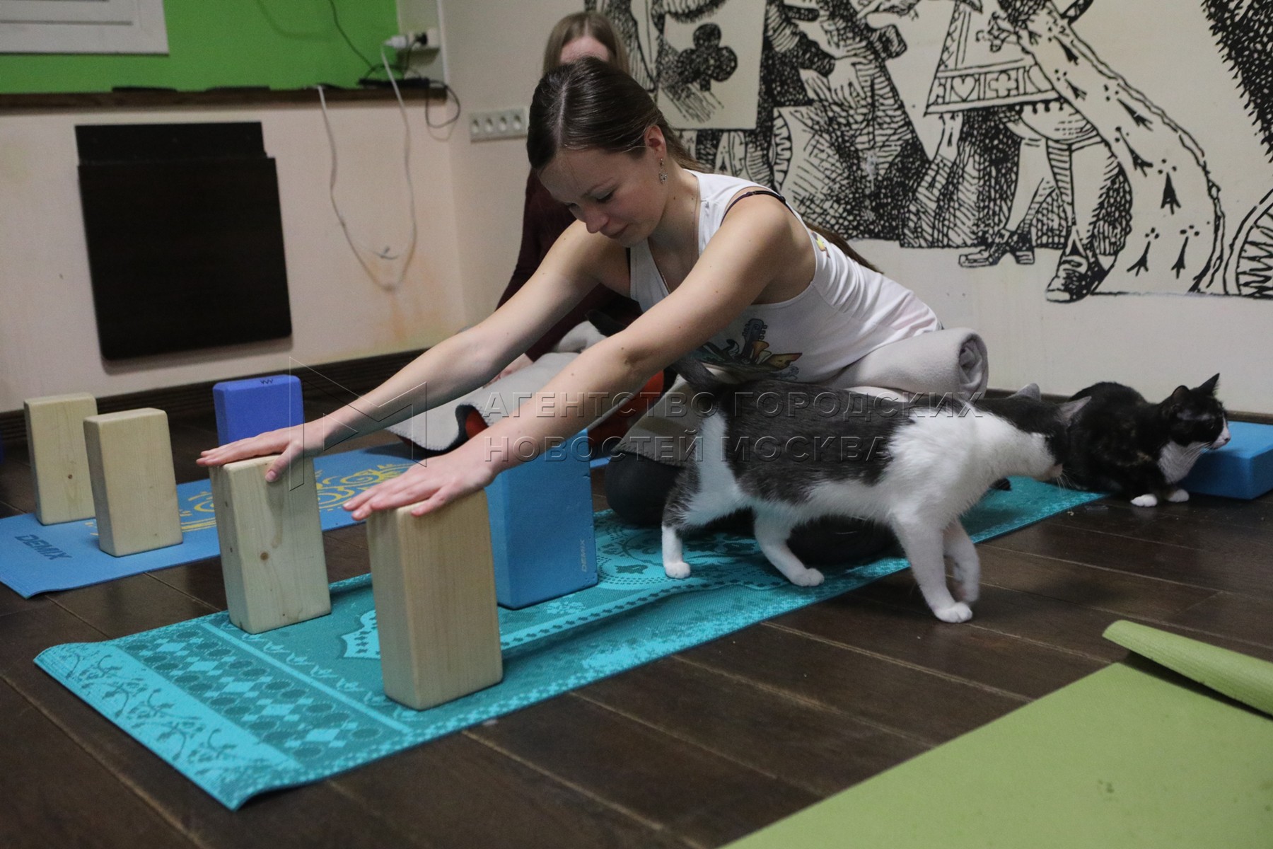 Занятия йогой в антикафе с кошками в центре Москвы.