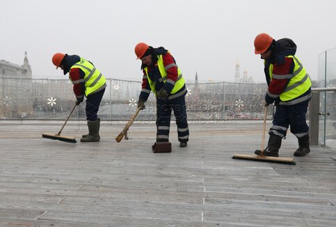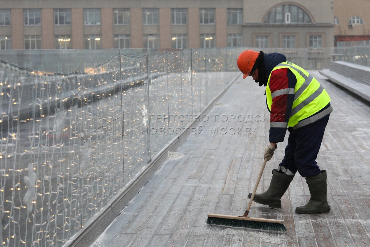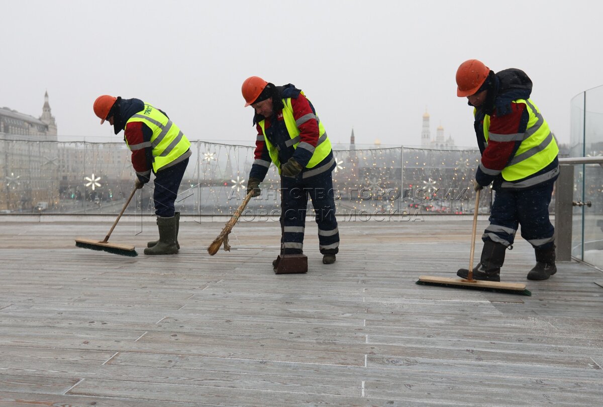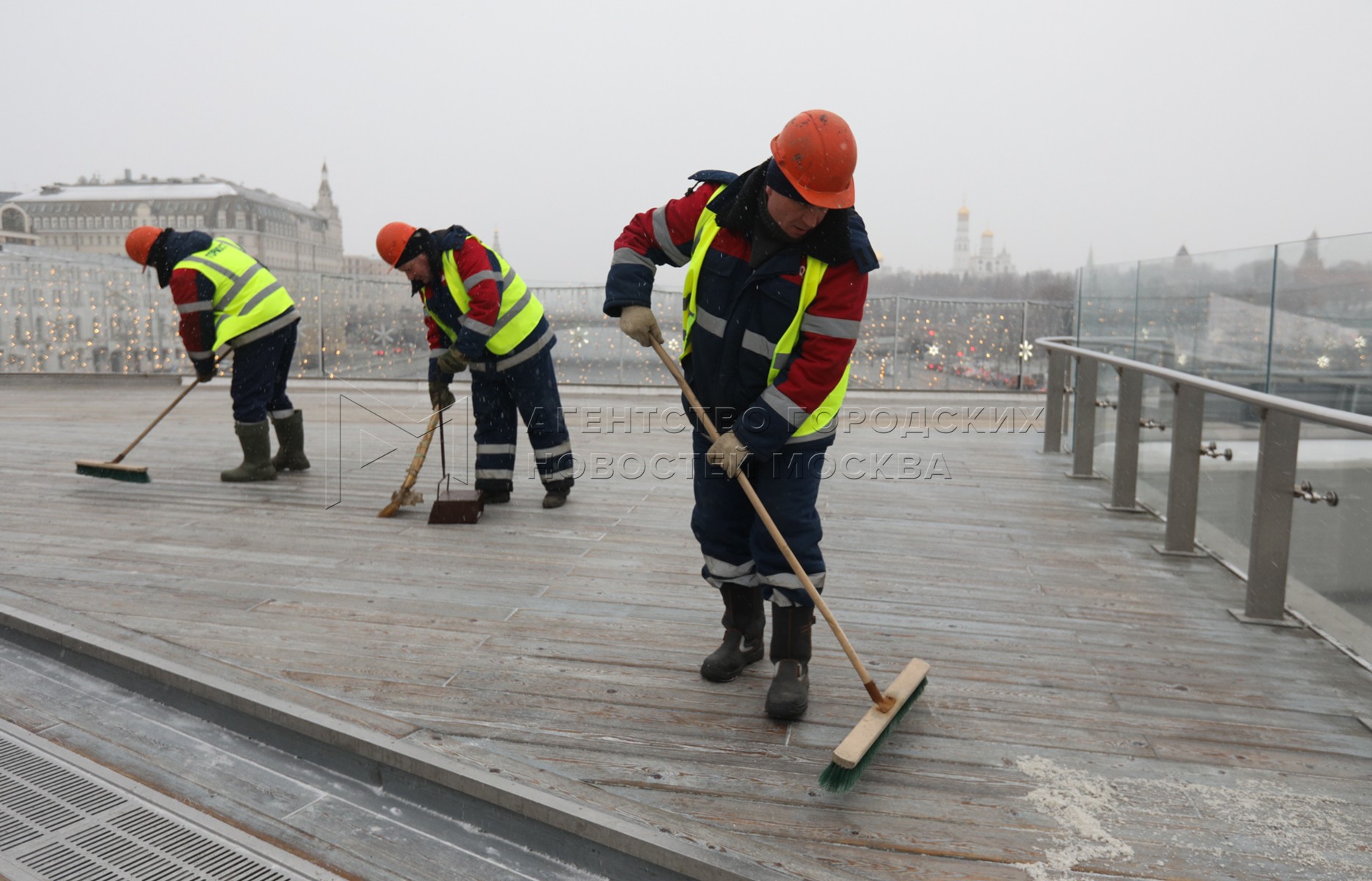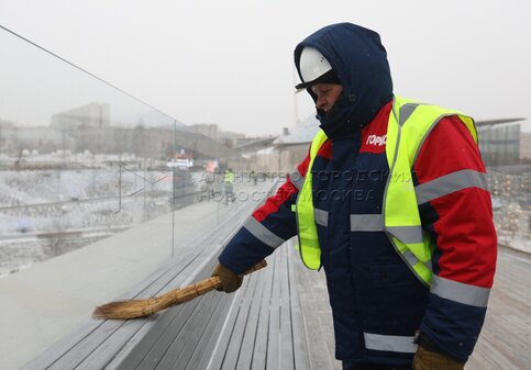 • Описание: Уборка снега и наледи на «Парящем мосту» в парке «Зарядье».