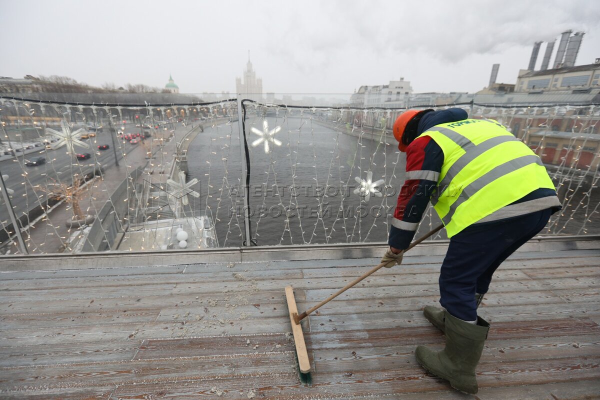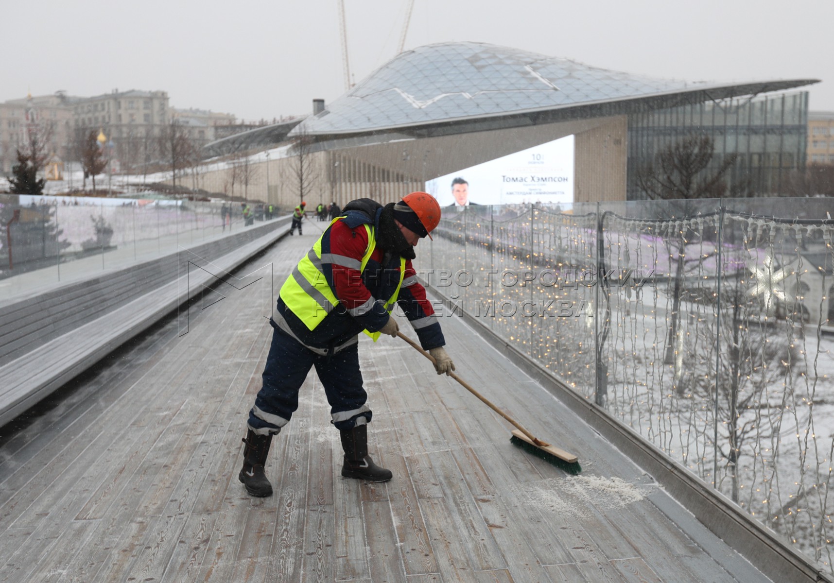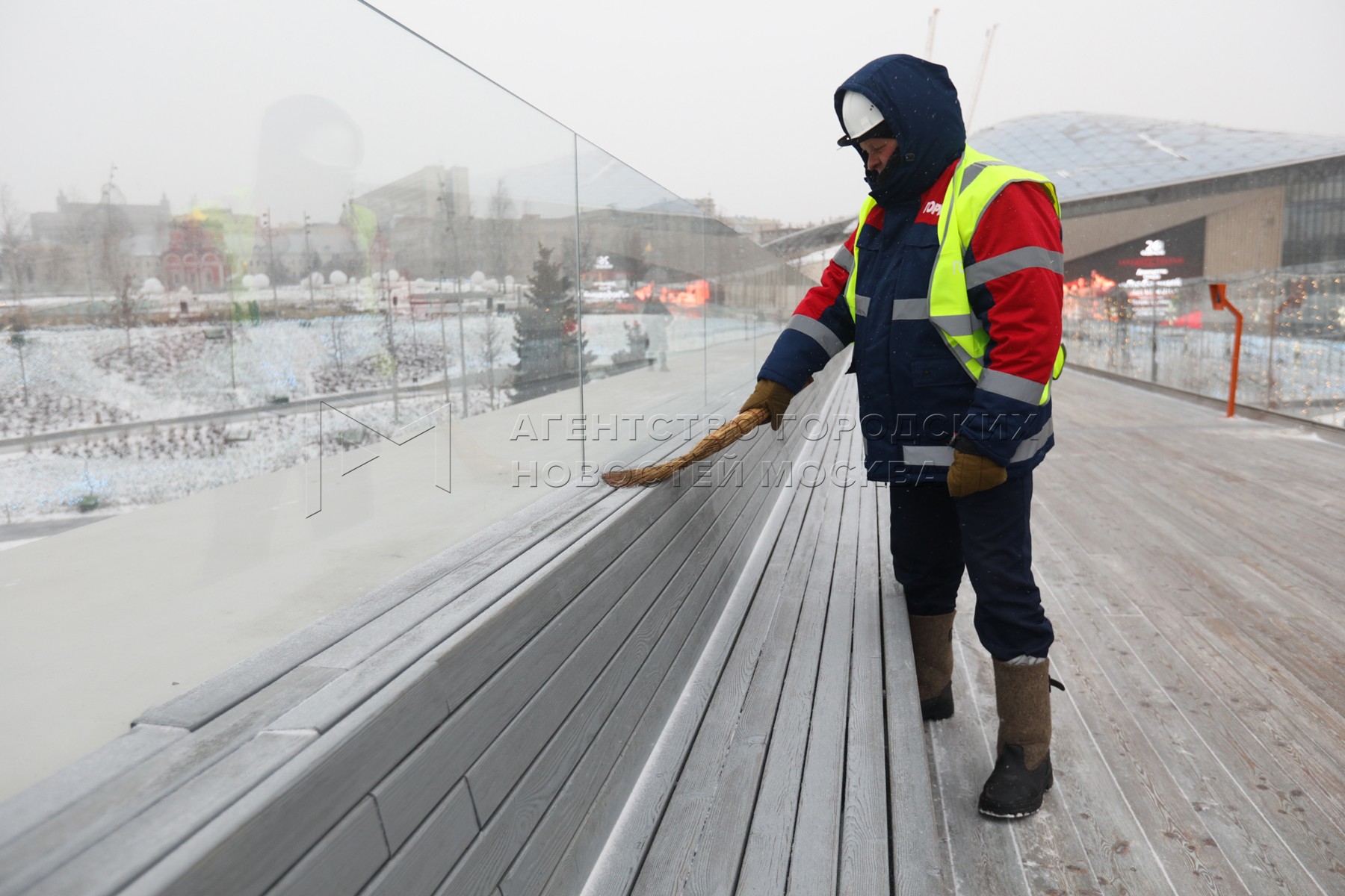 • Заголовок: Уборка снега и наледи на «Парящем мосту» в парке «Зарядье»