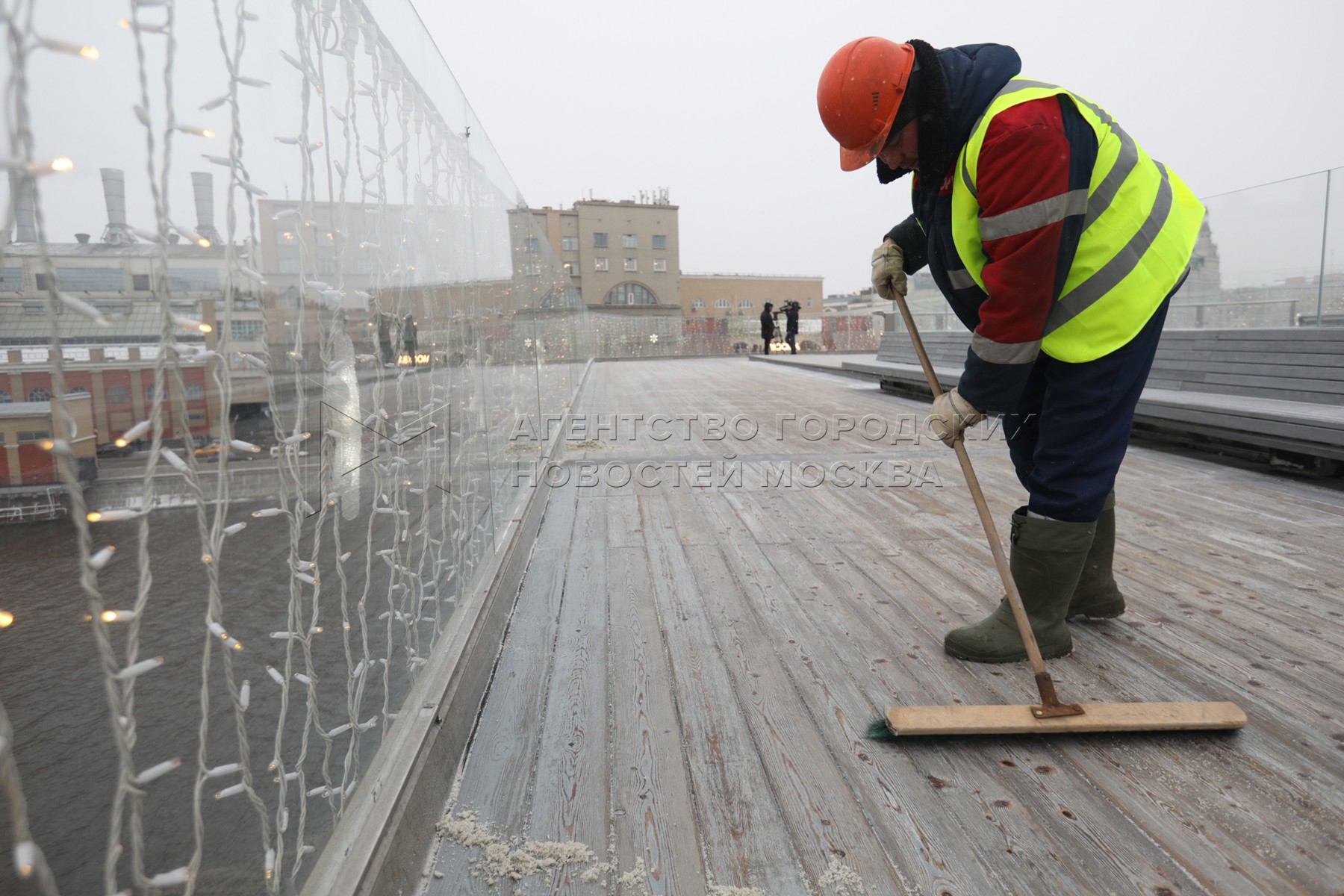 Уборка снега и наледи на «Парящем мосту» в парке «Зарядье».