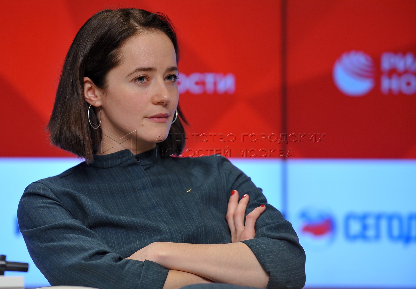 Актриса Ольга Лерман, исполнившая роль Екатерины - первой жены Михаила Калашникова во время встречи создателей фильма «Калашников» с журналистами.
