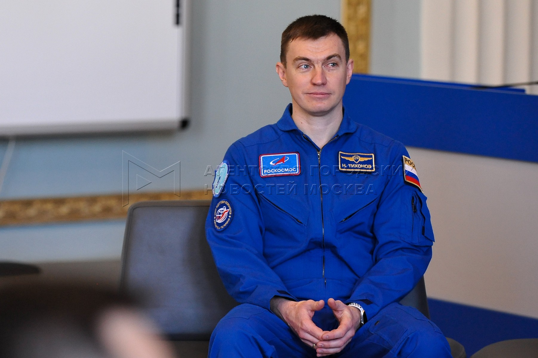 Член экипажа МКС-63 Николай Тихонов во время встречи «Уроки космоса: От мечты к п...