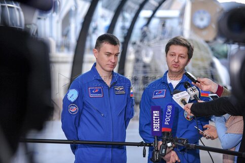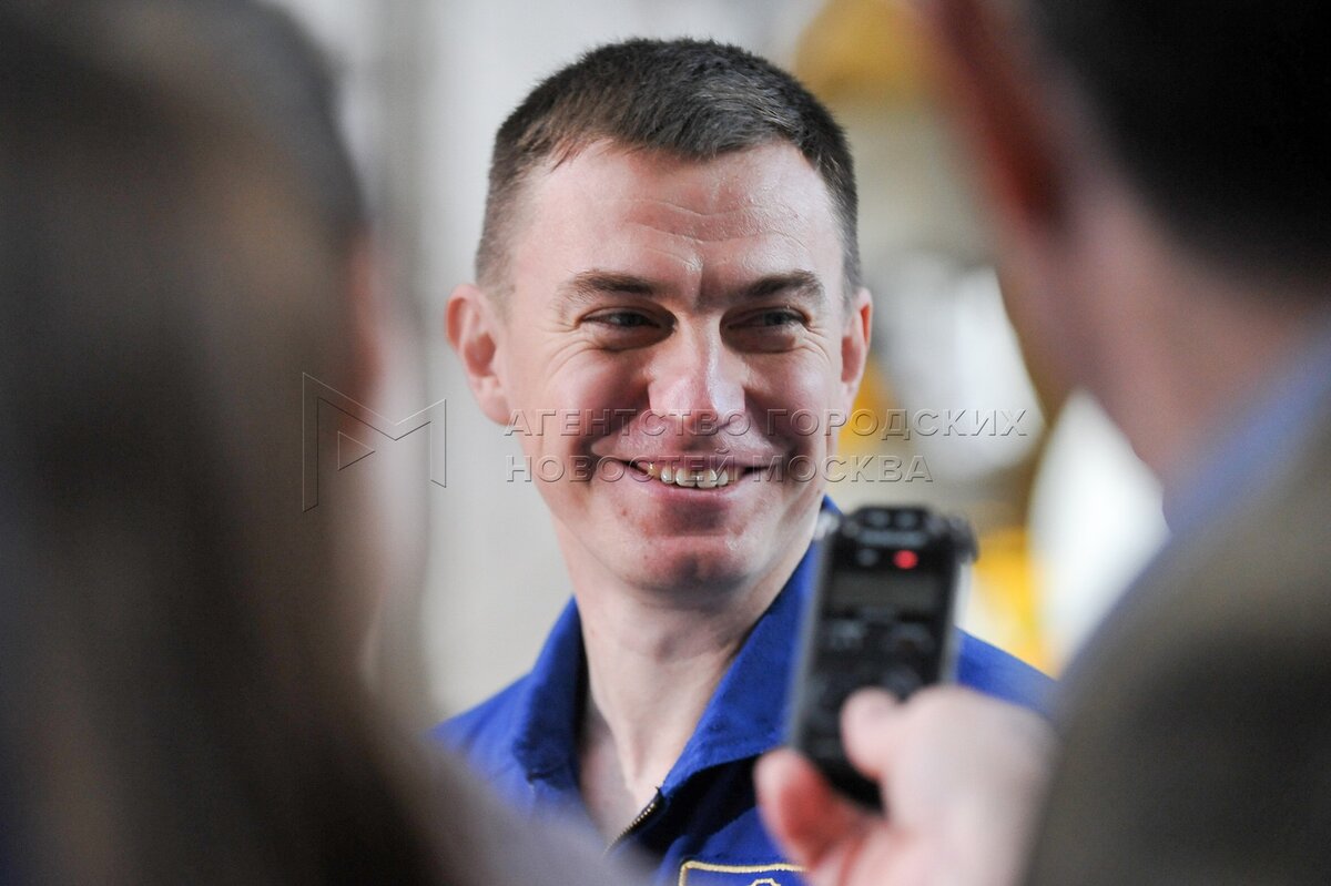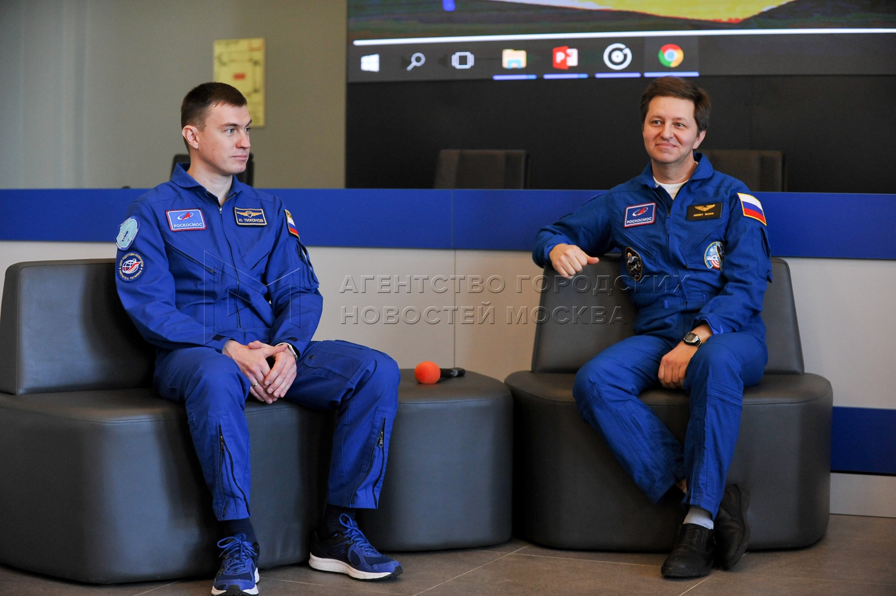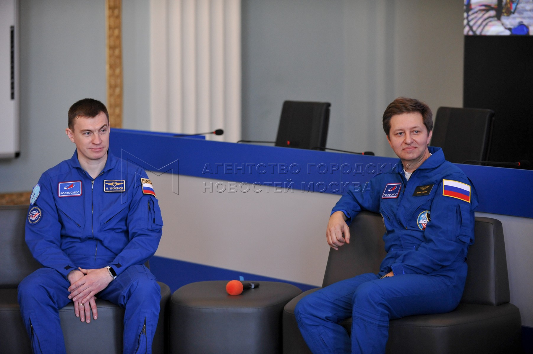 Члены экипажа МКС-63 Николай Тихонов и Андрей Бабкин, ведущий встречи летчик-косм...