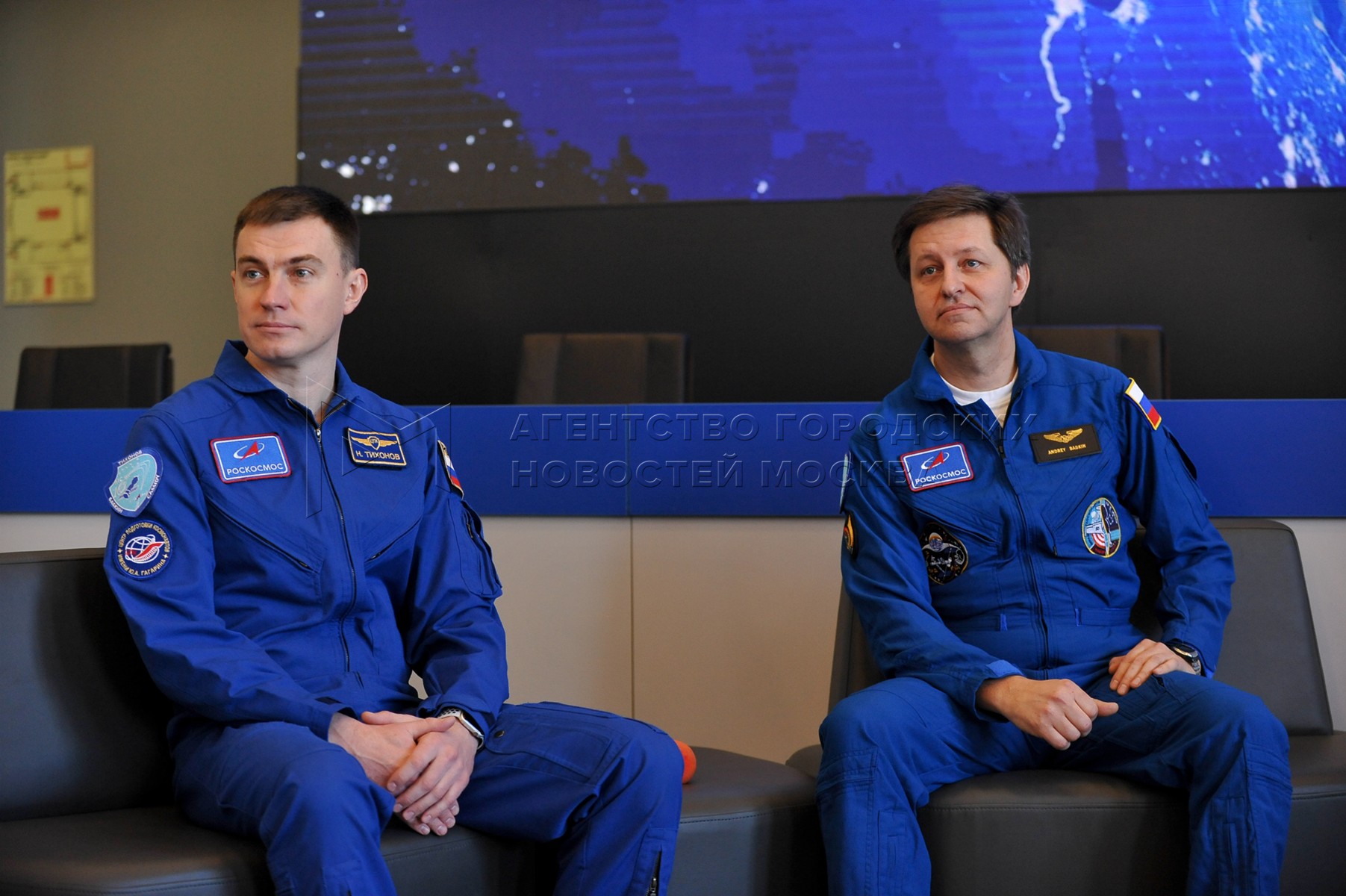 Члены экипажа МКС-63 Николай Тихонов (слева) и Андрей Бабкин во время встречи «Ур...