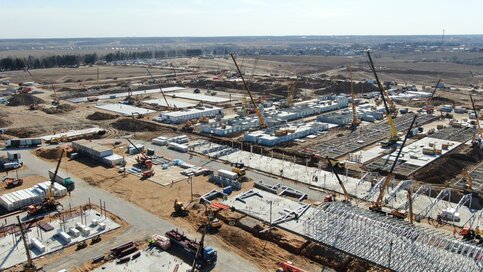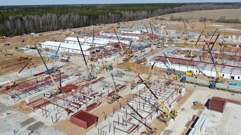 Вид с квадрокоптера на строительство мобильного комплекса новой инфекционной больницы в ТиНАО.