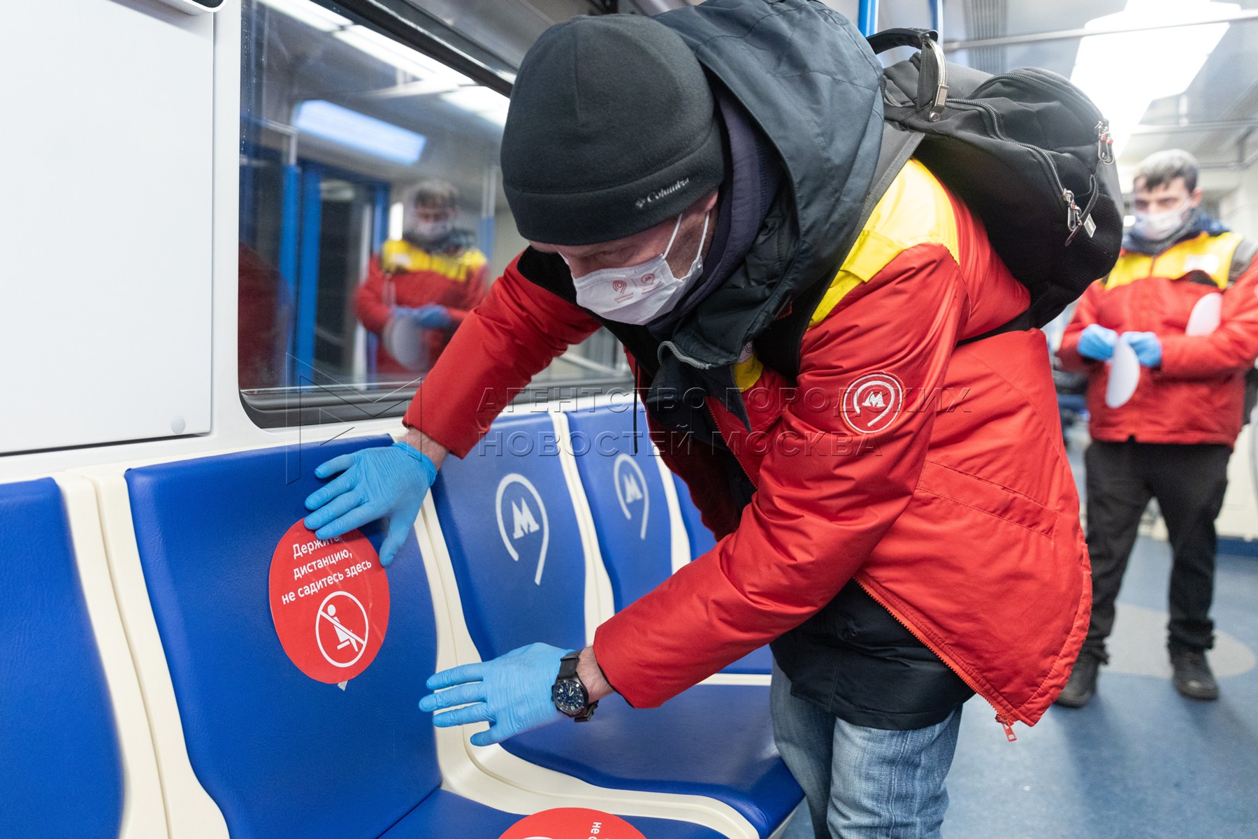 • Заголовок: Стикеры, напоминающие о соблюдении дистанции пассажиров метро в связи с режимом самоизоляции