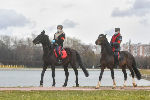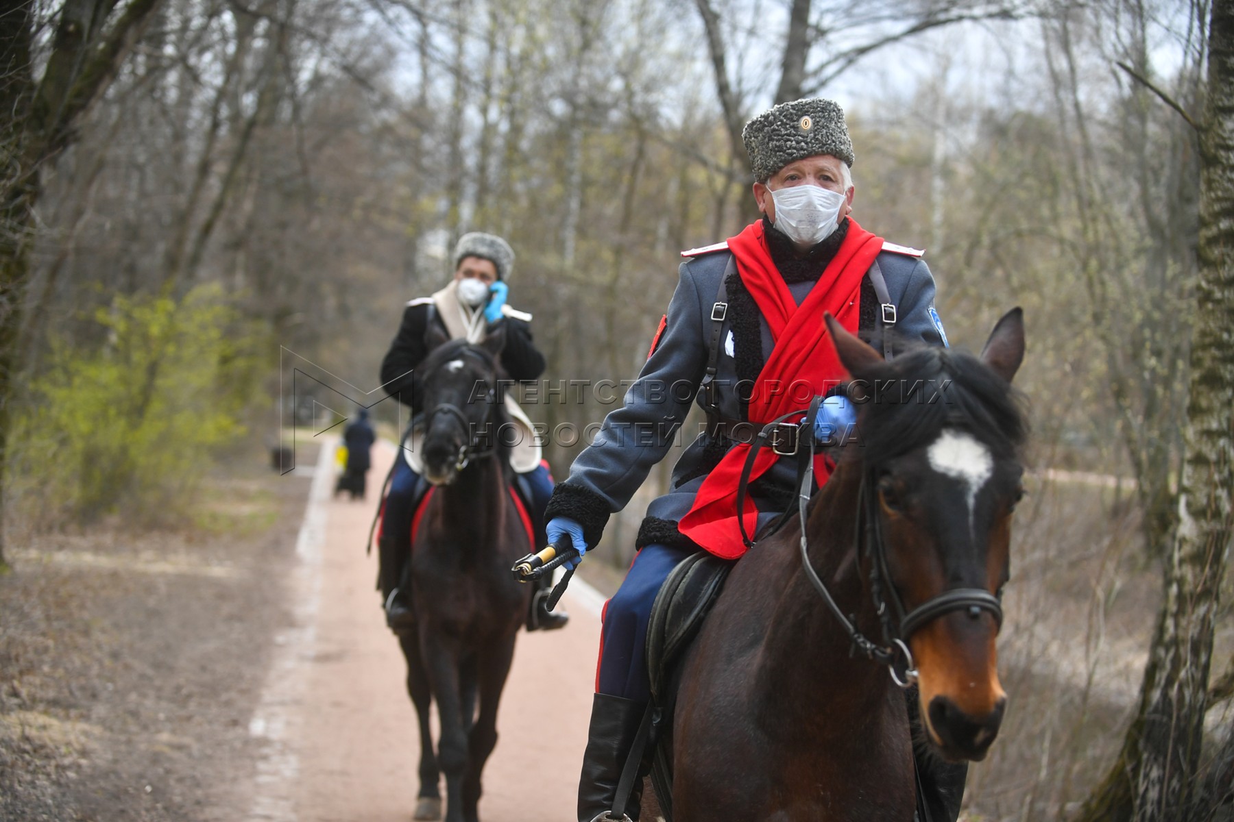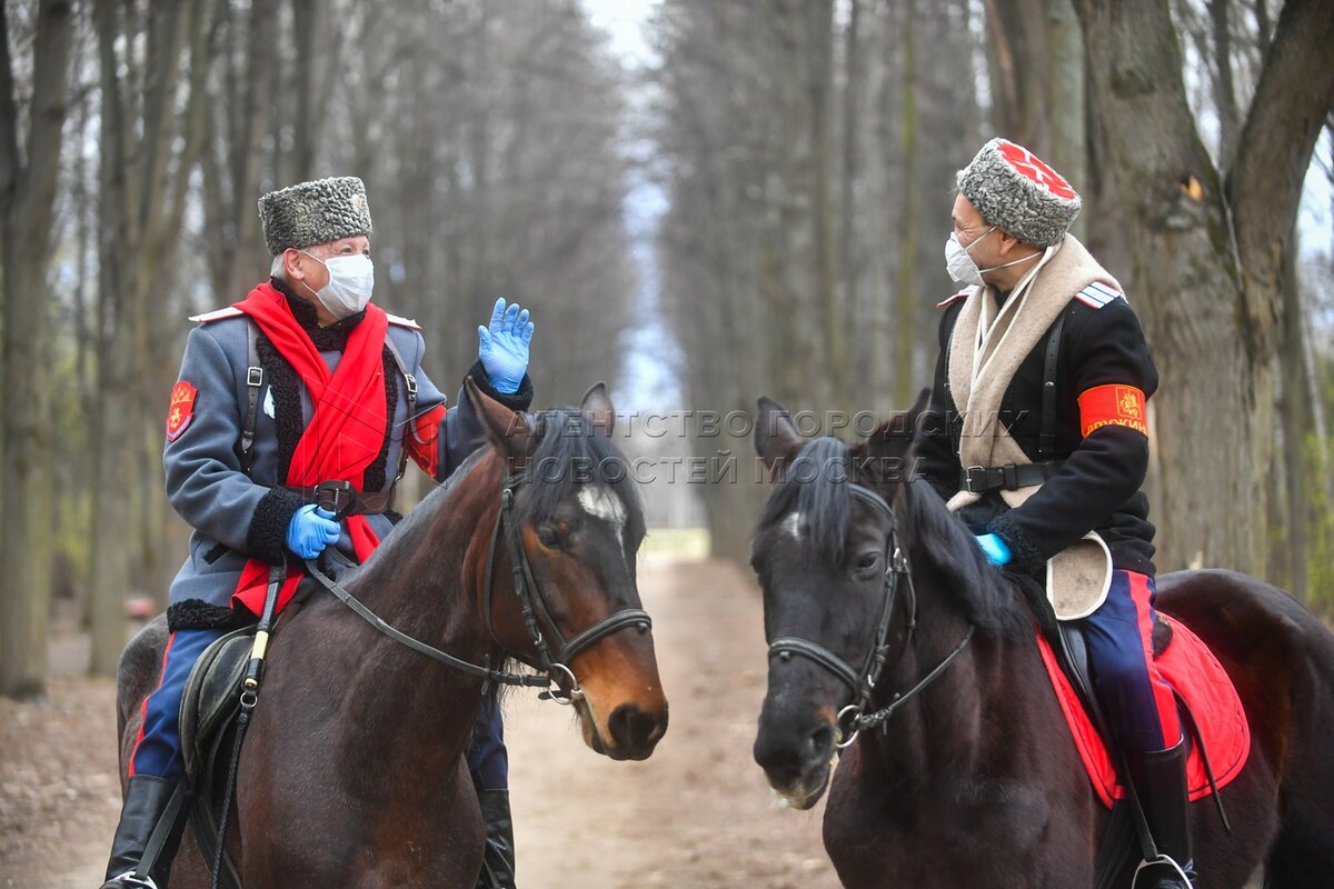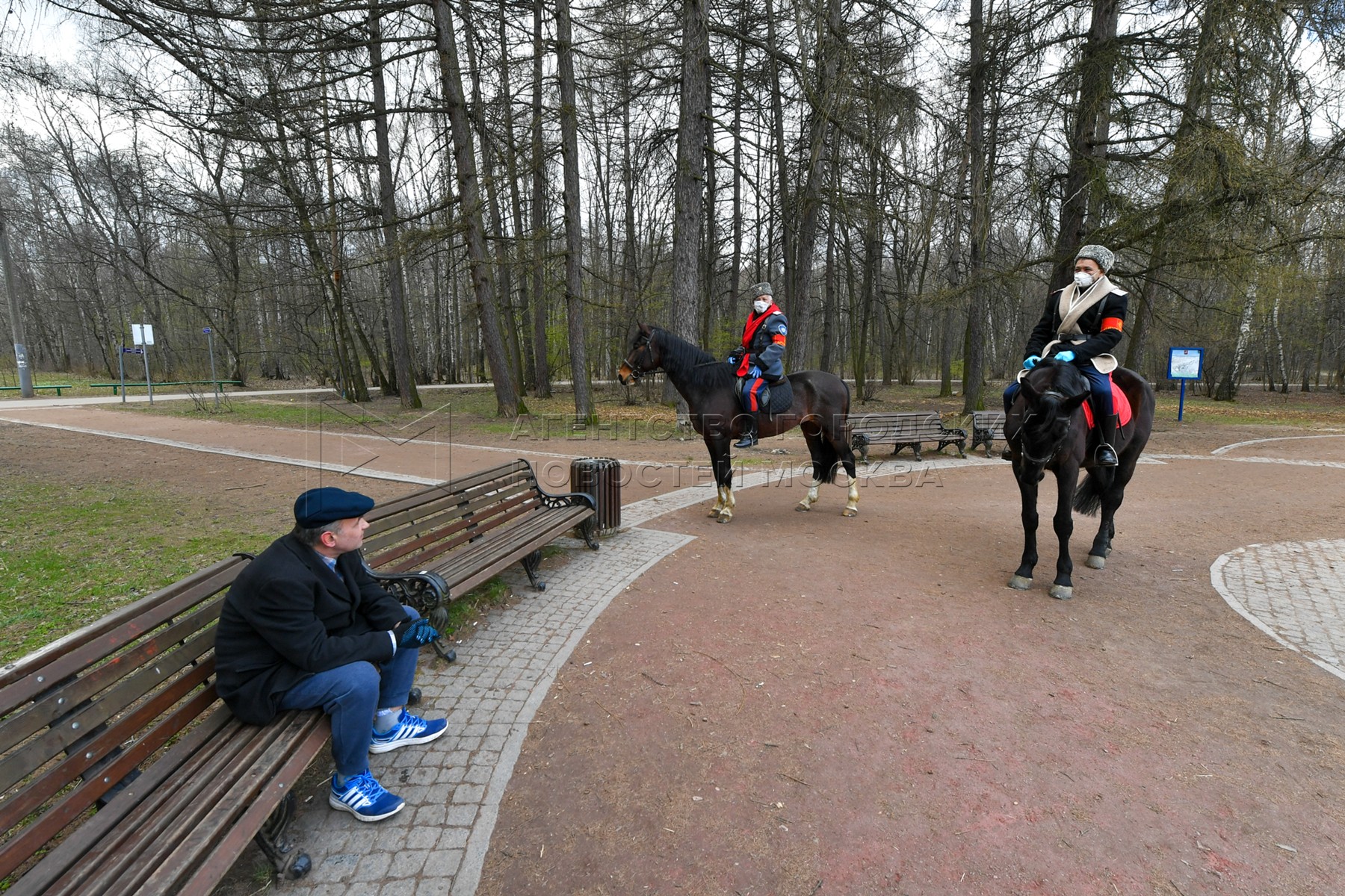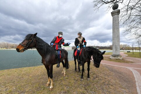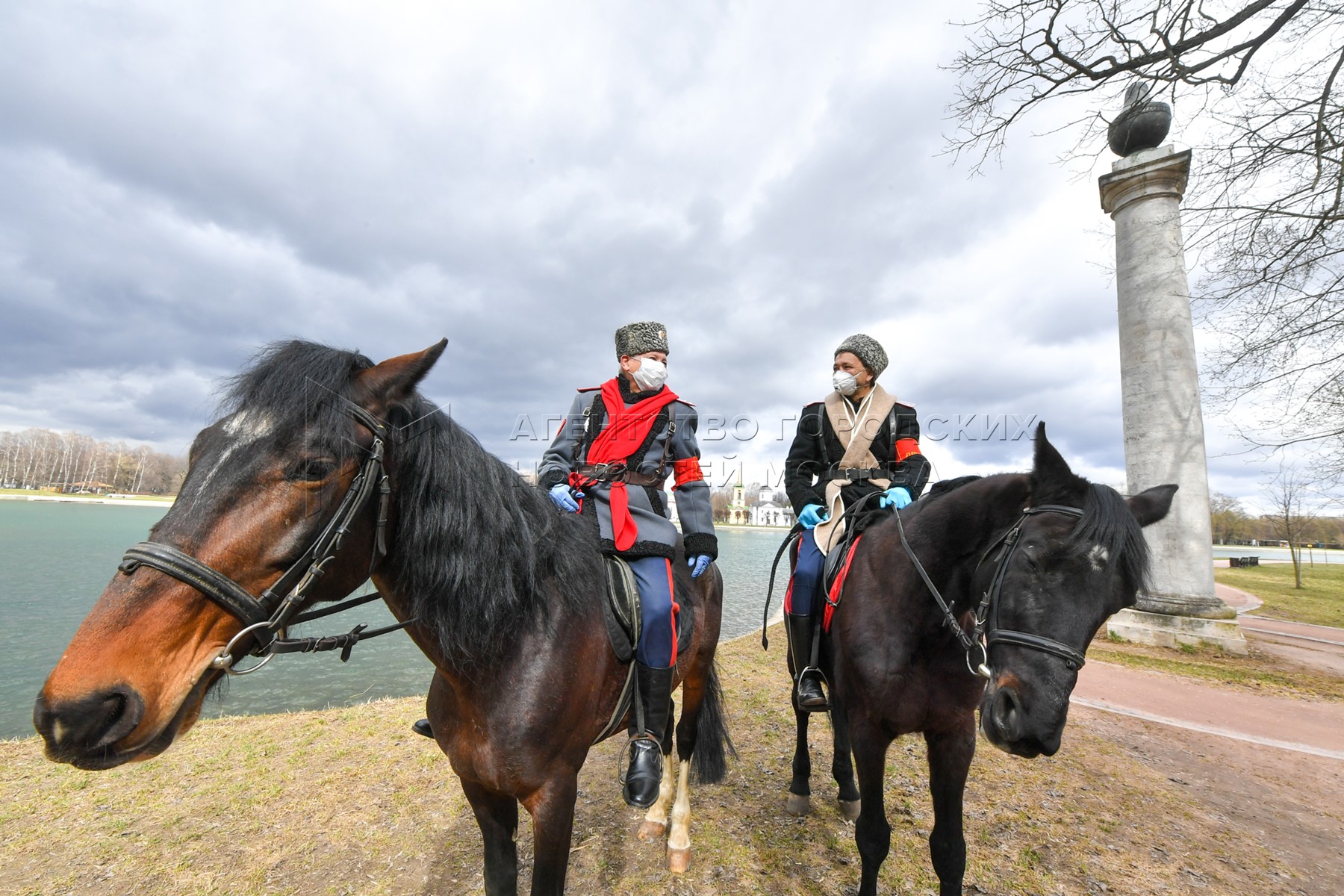• Описание: Патрулирование музея-усадьбы «Кусково» на востоке Москвы казаками-дружинниками во время пандемии COVID-19 11 апреля 2020 г.