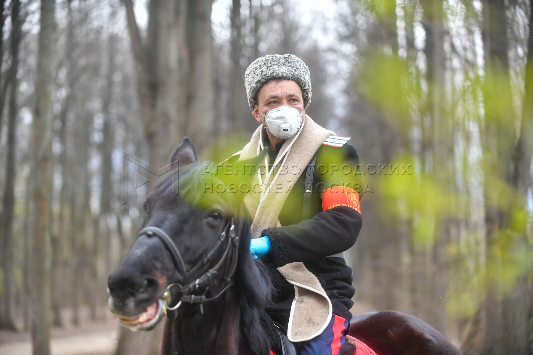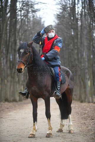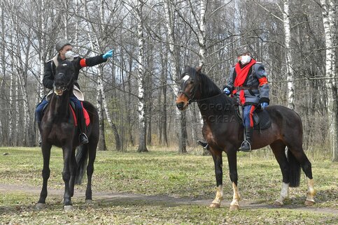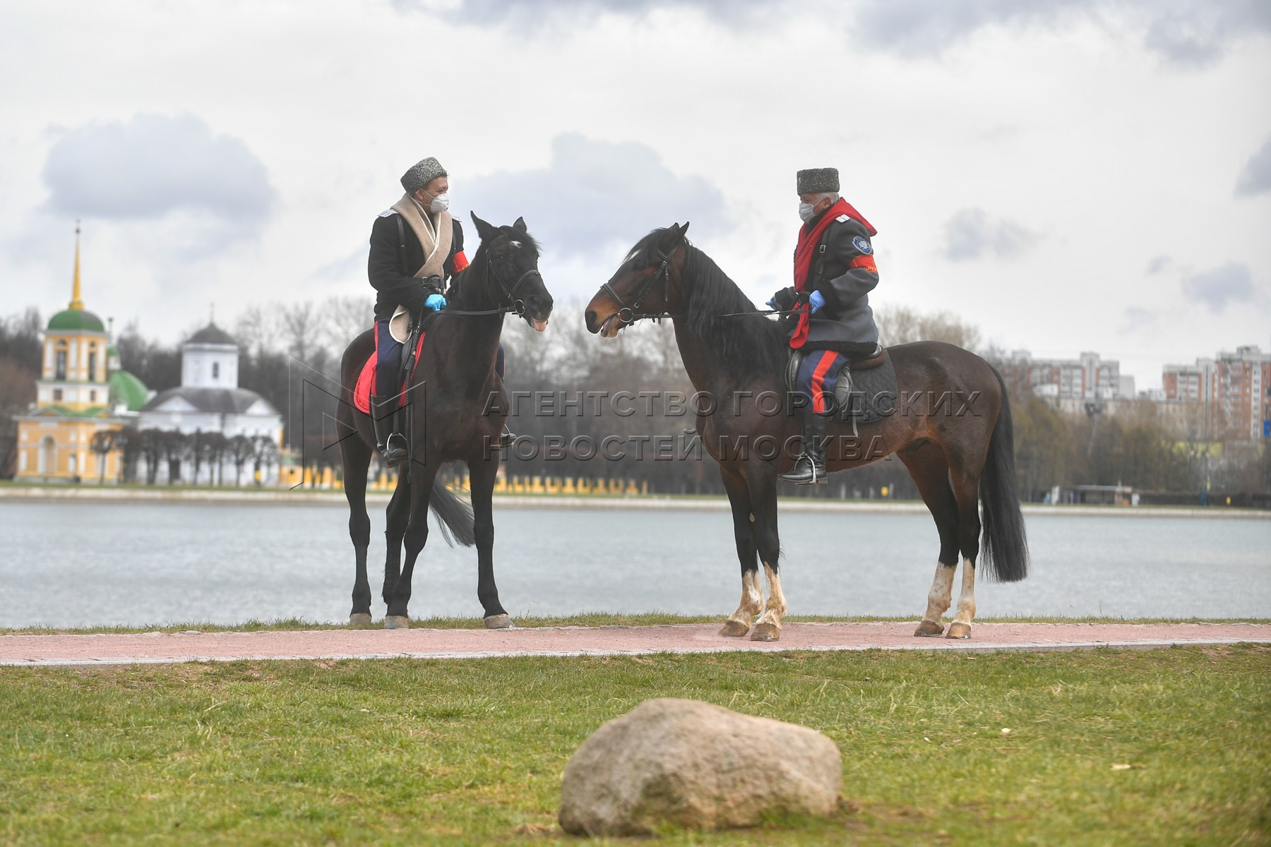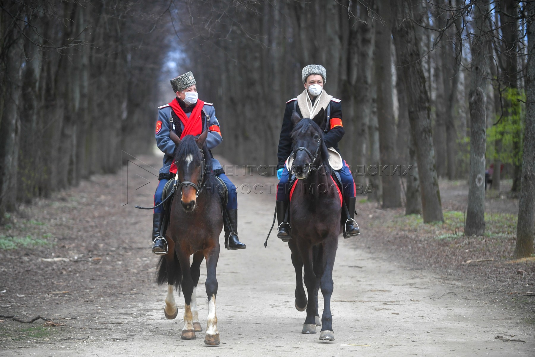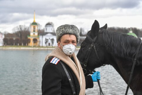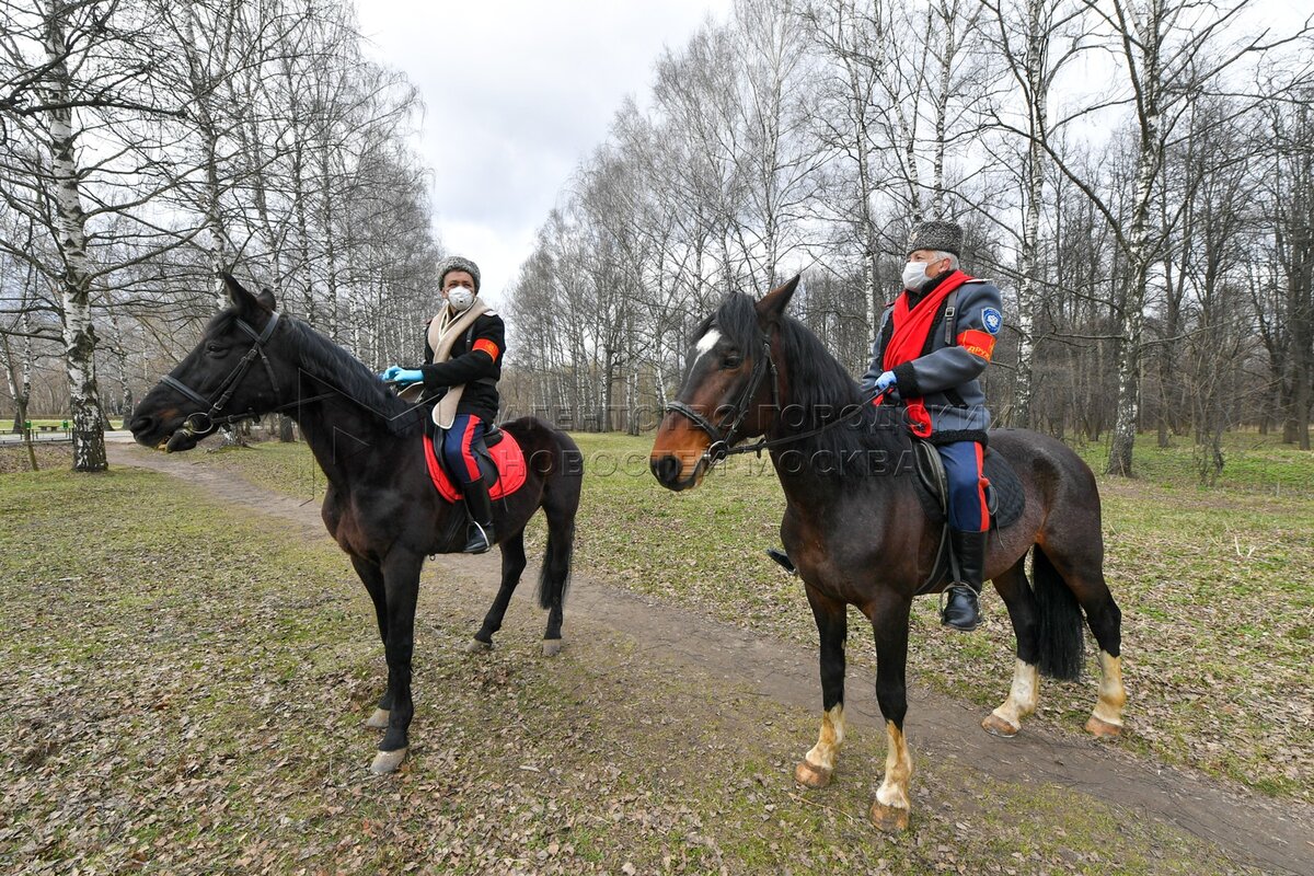 • Описание: Патрулирование музея-усадьбы «Кусково» на востоке Москвы казаками-дружинниками во время пандемии COVID-19 11 апреля 2020 г.