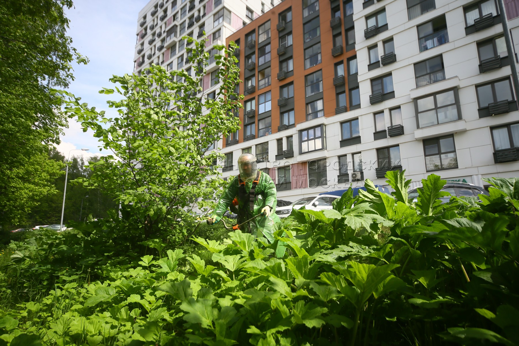 Работы по уничтожению борщевика в Москве на ул. Академика Ландау.