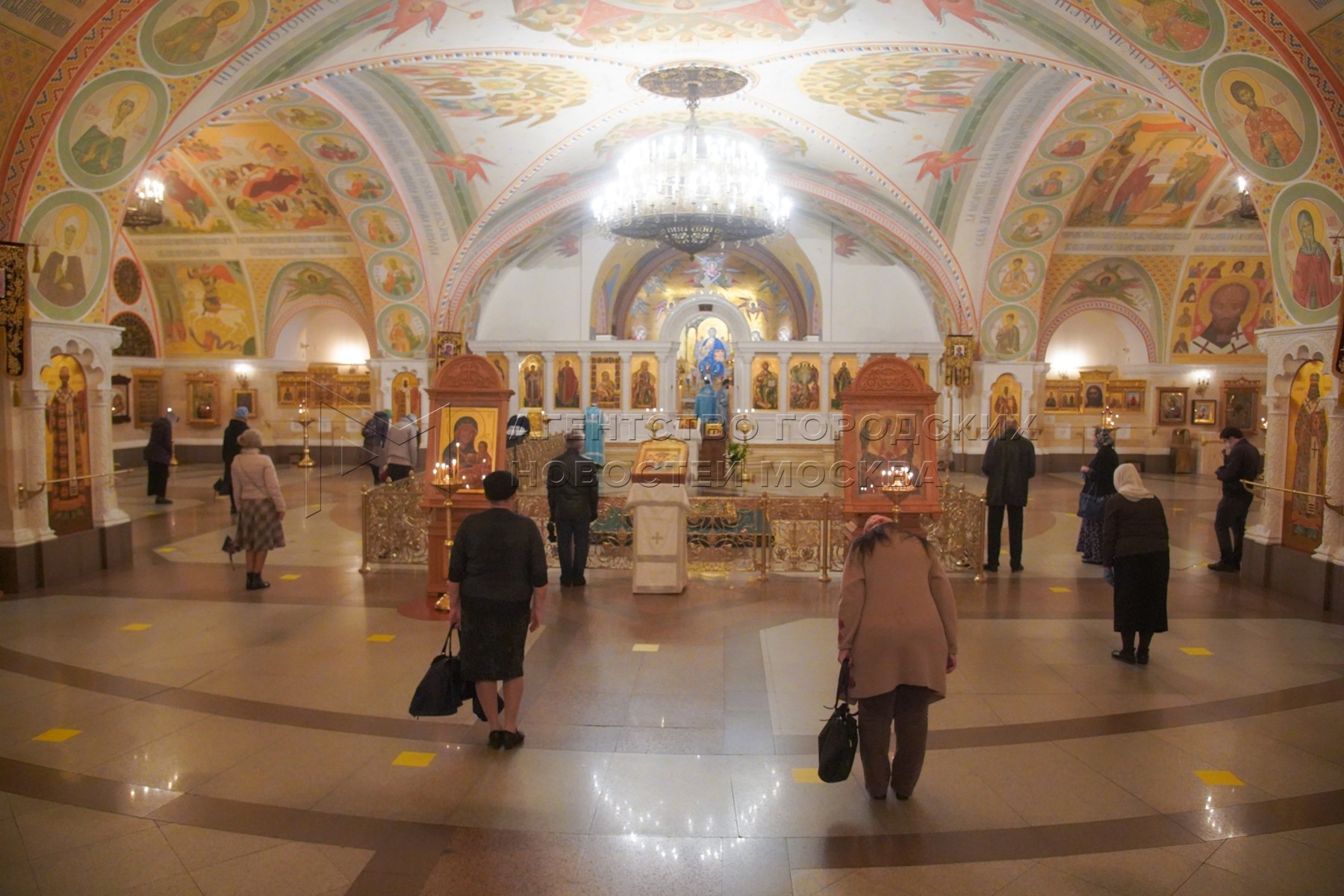 • Описание: Прихожане в храме Христа Спасителя, открывшемся после смягчения ограничений, введенных из-за распространения коронавирусной инфекции.