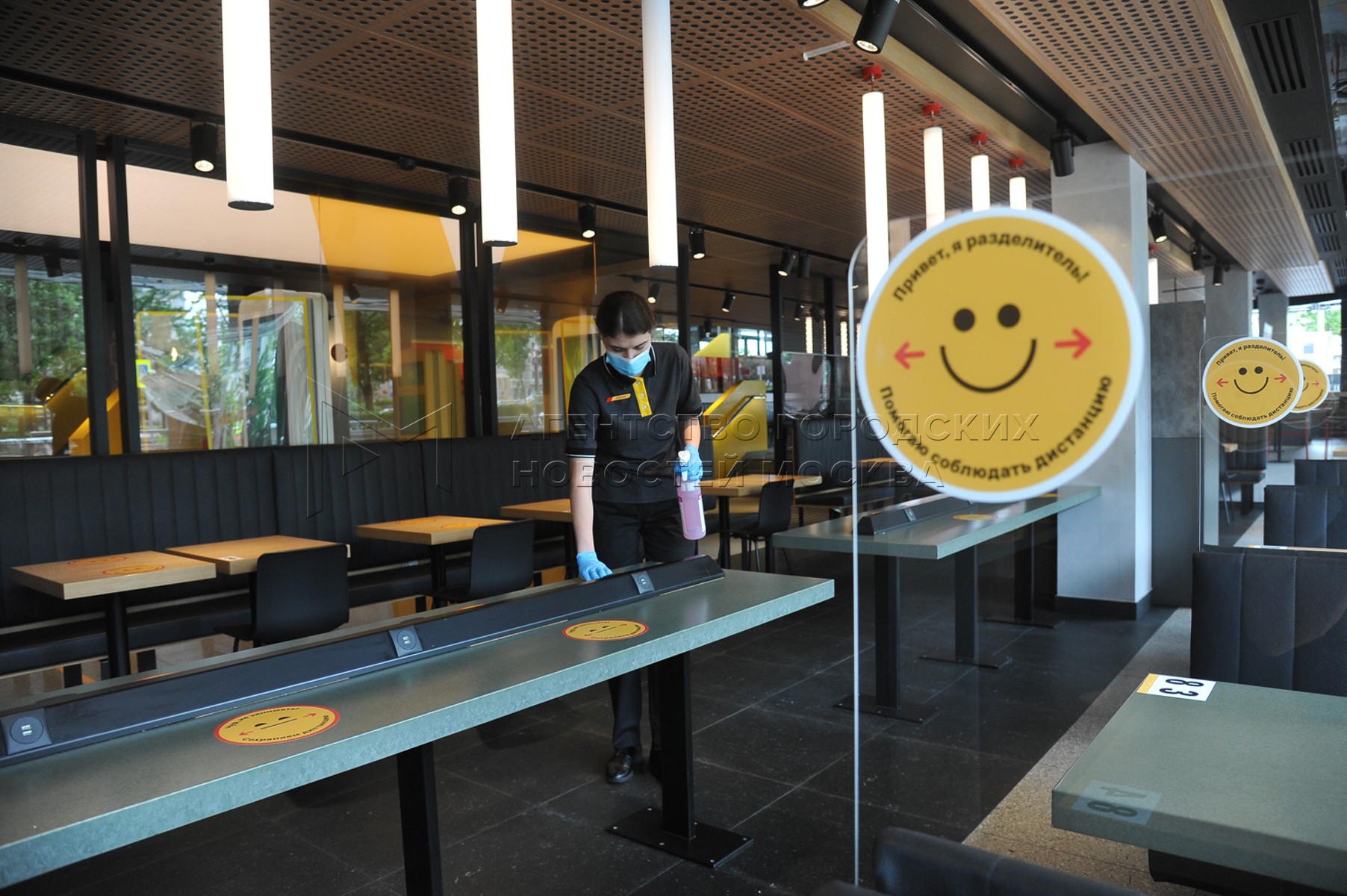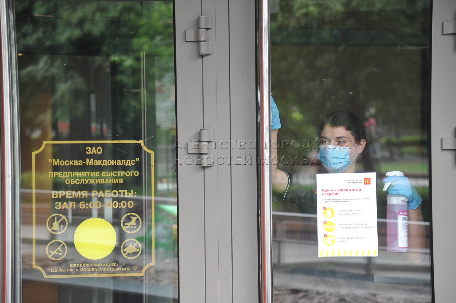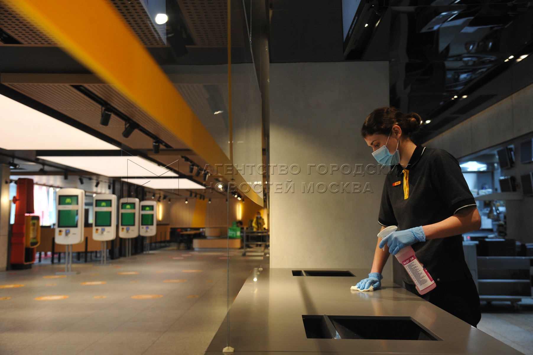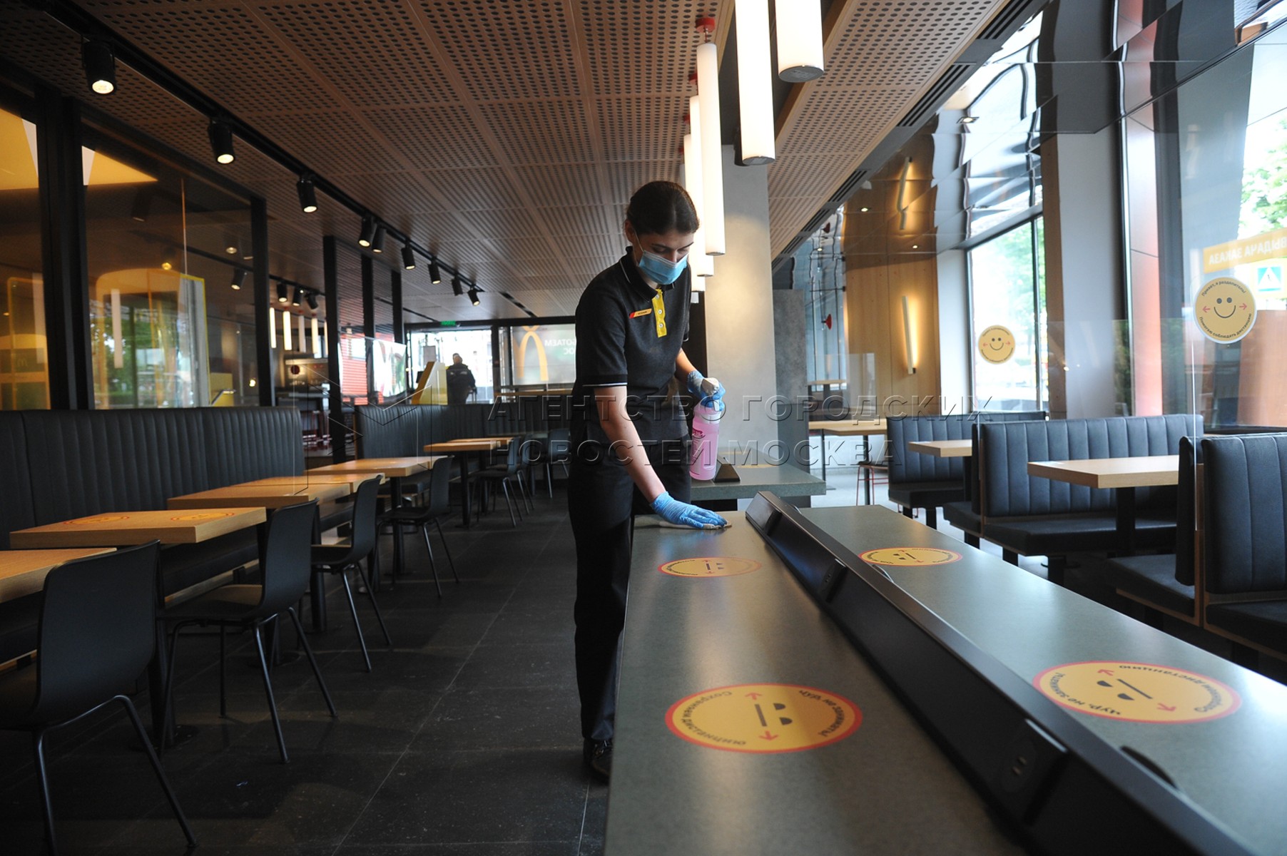 - Описание: Подготовка ресторана «Макдоналдс» к открытию после смягчения режима самоизоляции в Москве.