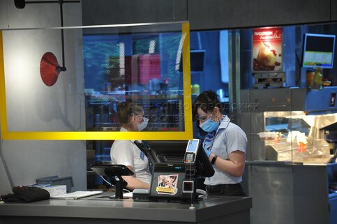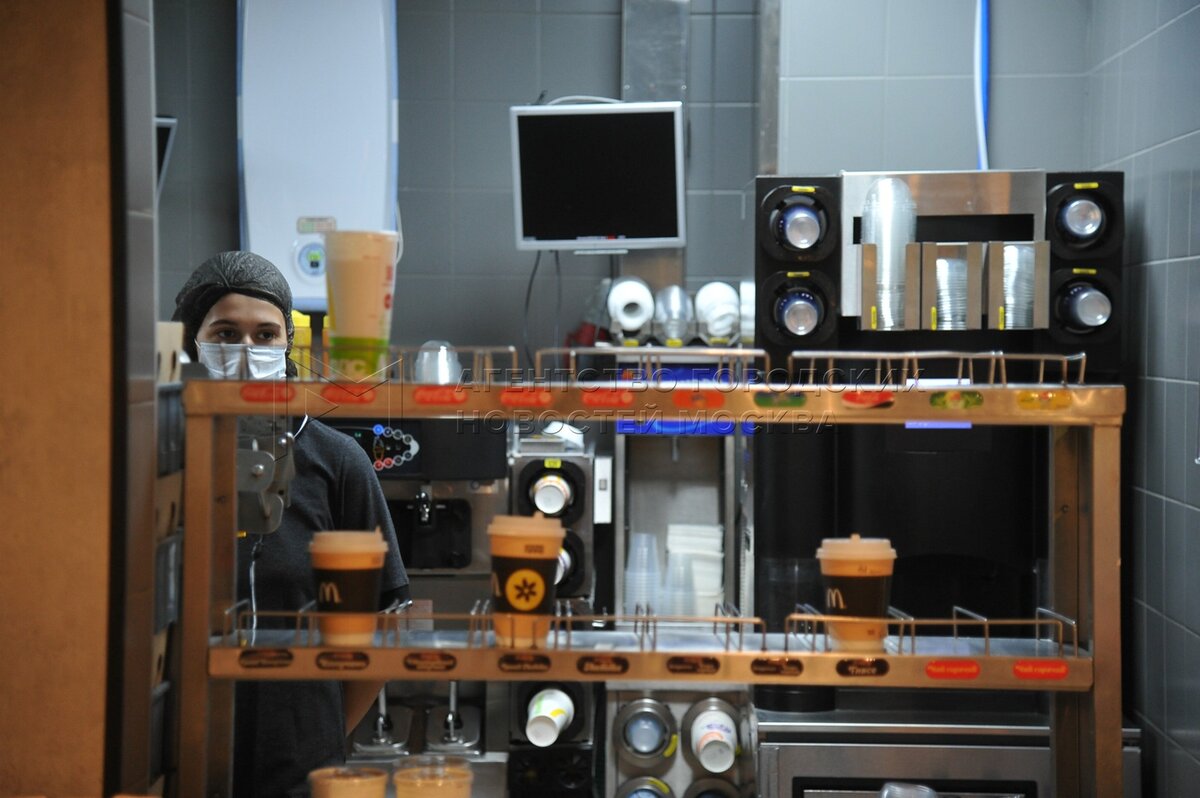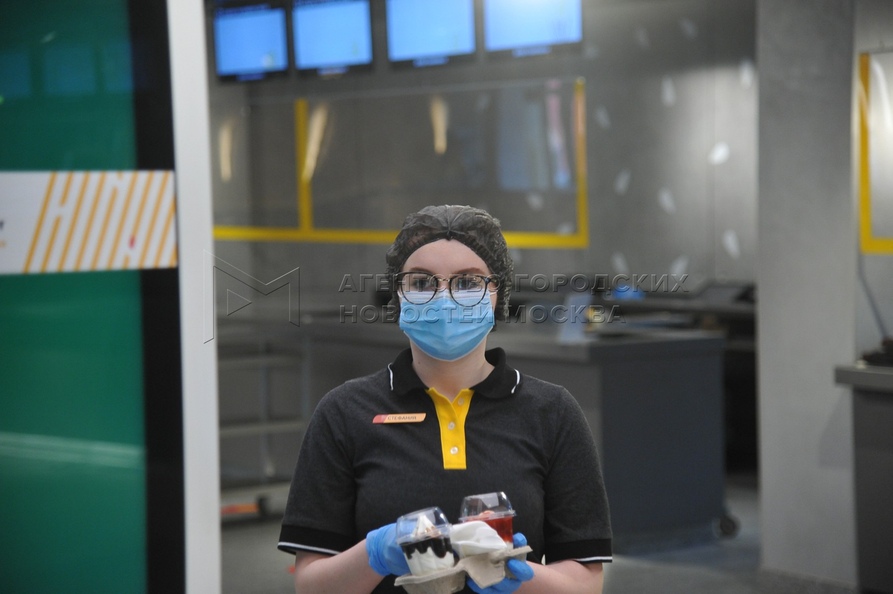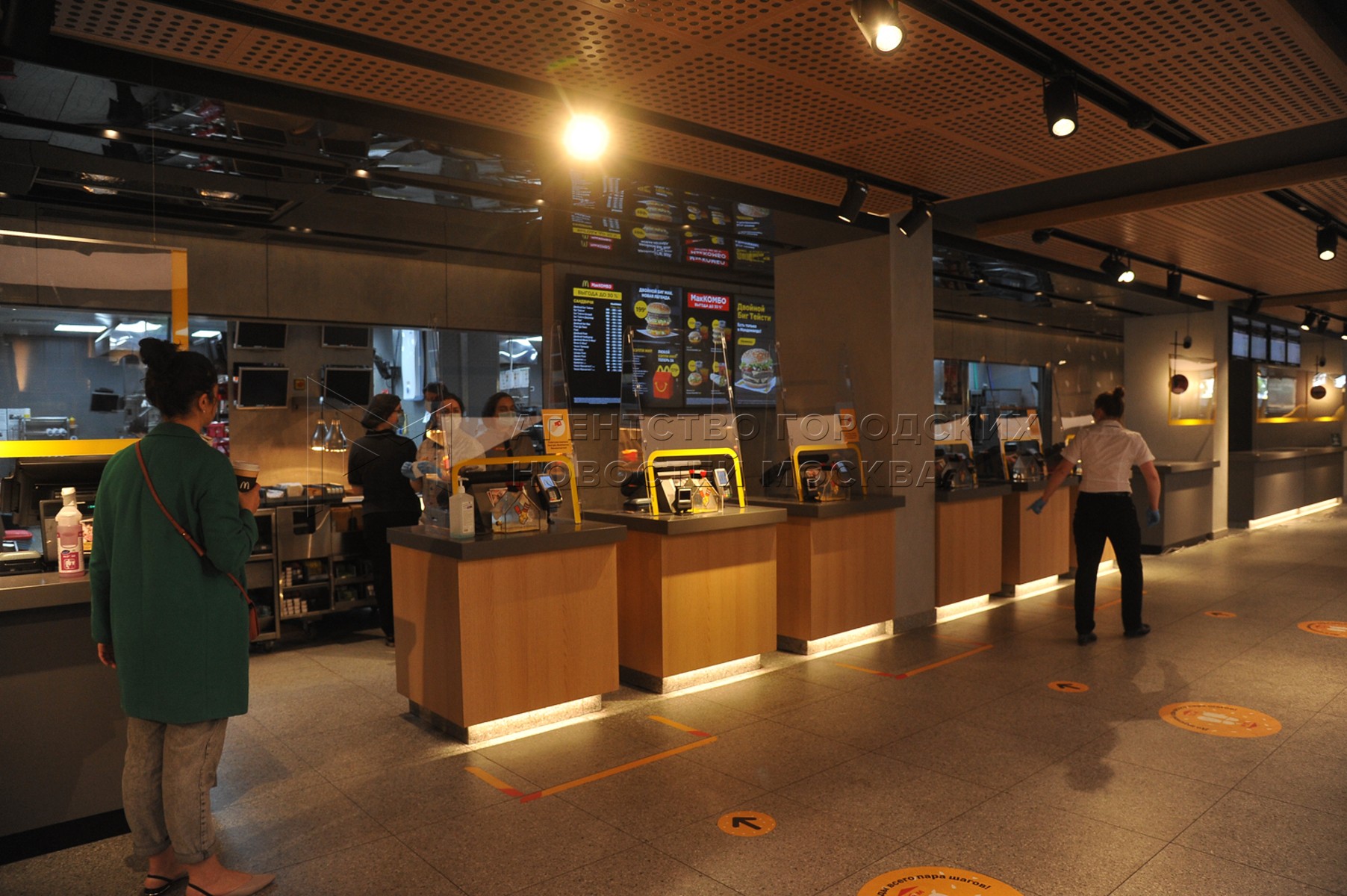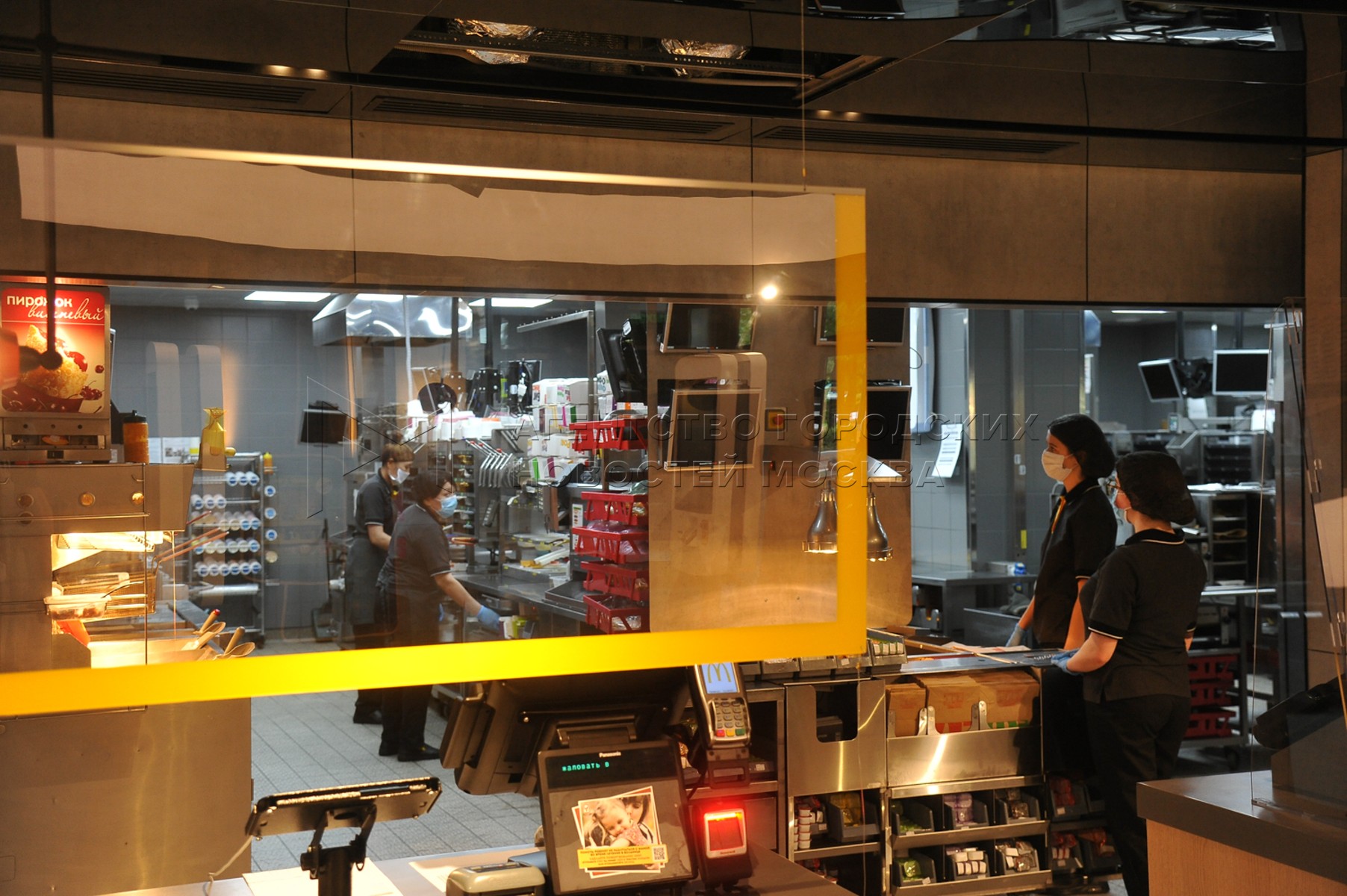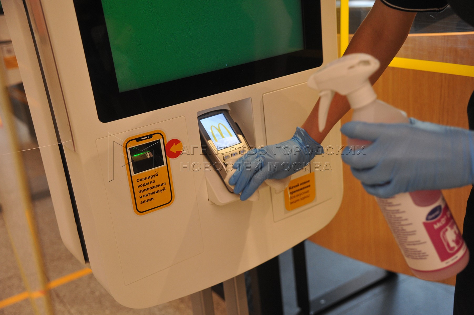 - Описание: Подготовка ресторана «Макдоналдс» к открытию после смягчения режима самоизоляции в Москве.