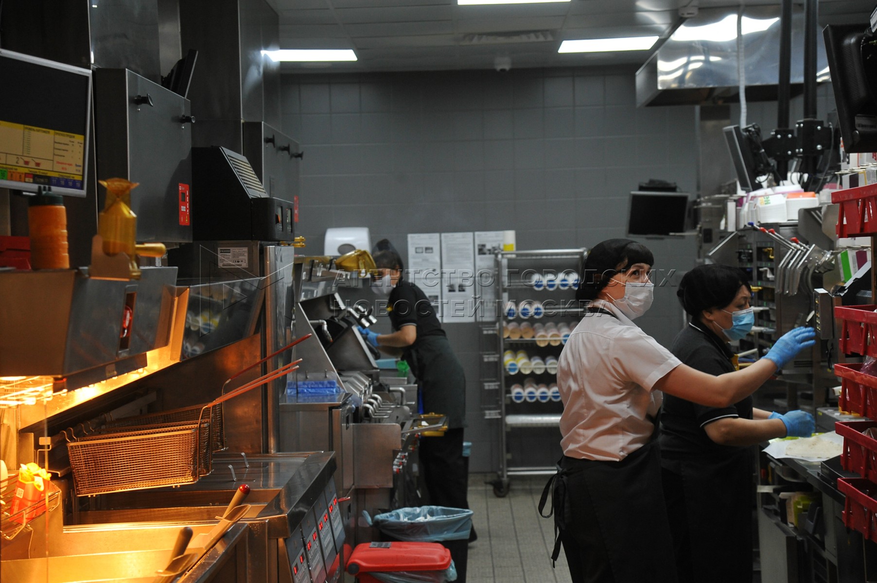 - Описание: Подготовка ресторана «Макдоналдс» к открытию после смягчения режима самоизоляции в Москве.