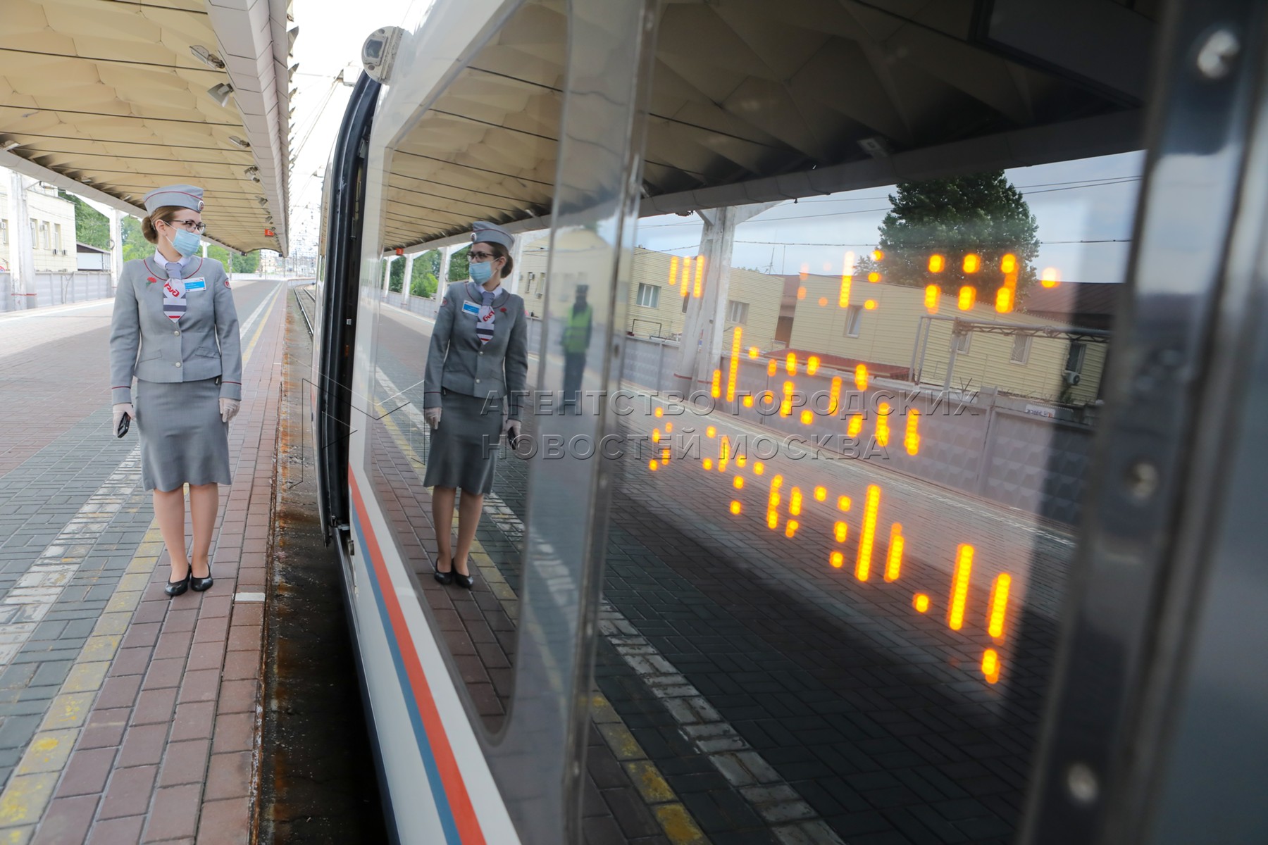 Отправление скоростного поезда «Сапсан» в Санкт Петербург с Ленинградского вокзал...