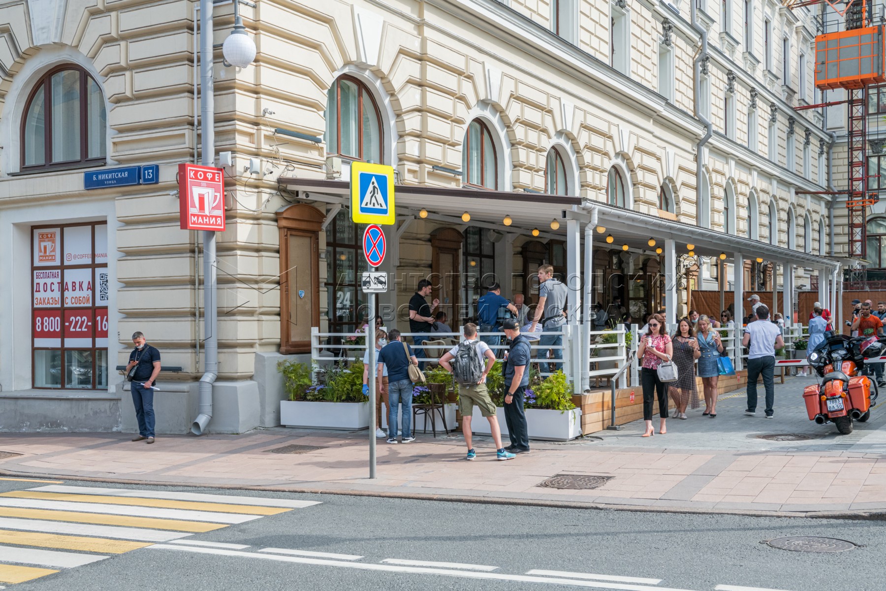 Летняя веранда кофейни «Кофемания» на Большой Никитской улице, открывшаяся после смягчения режима самоизоляции. Фото: Пресс-служба мэра и правительства Москвы. Максим Мишин.