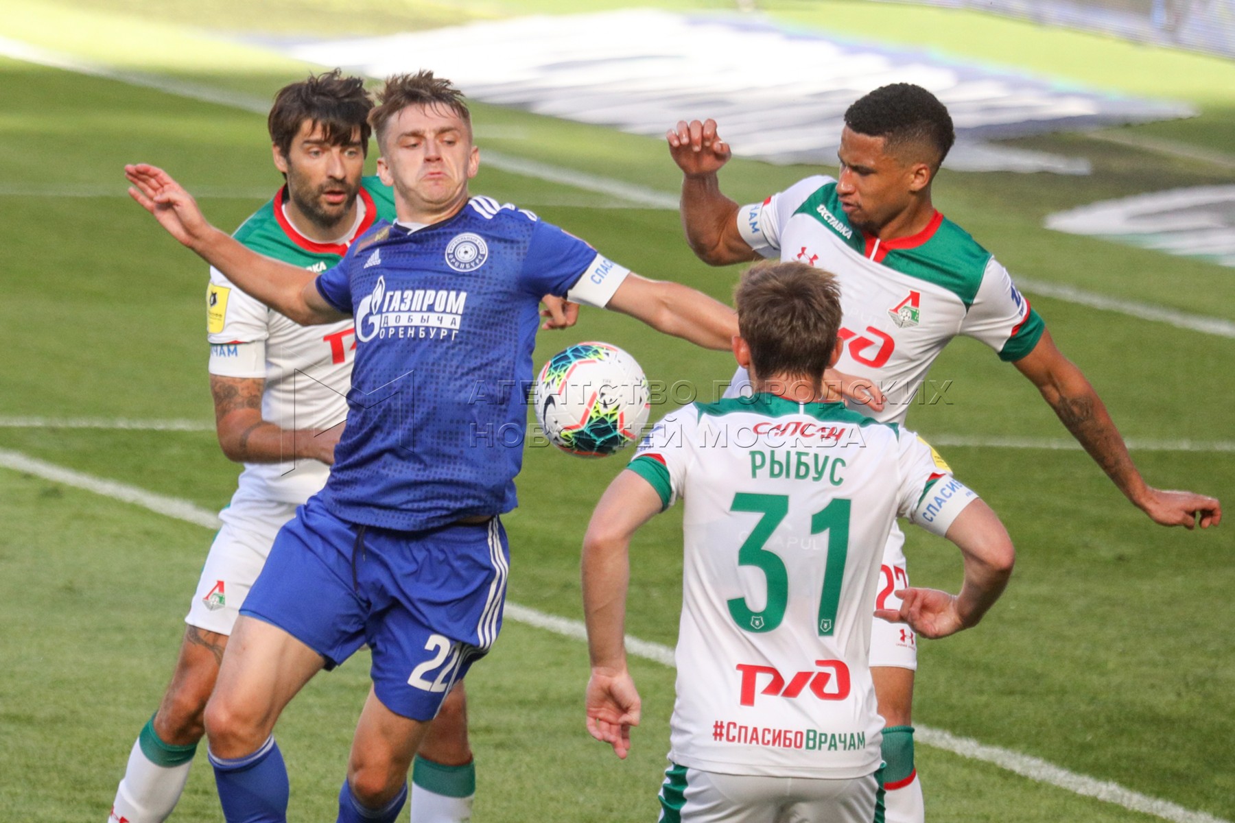 Слева направо - игрок «Оренбурга» Даниэль Мишкич, игроки «Локомотива» Гжегож Кры...
