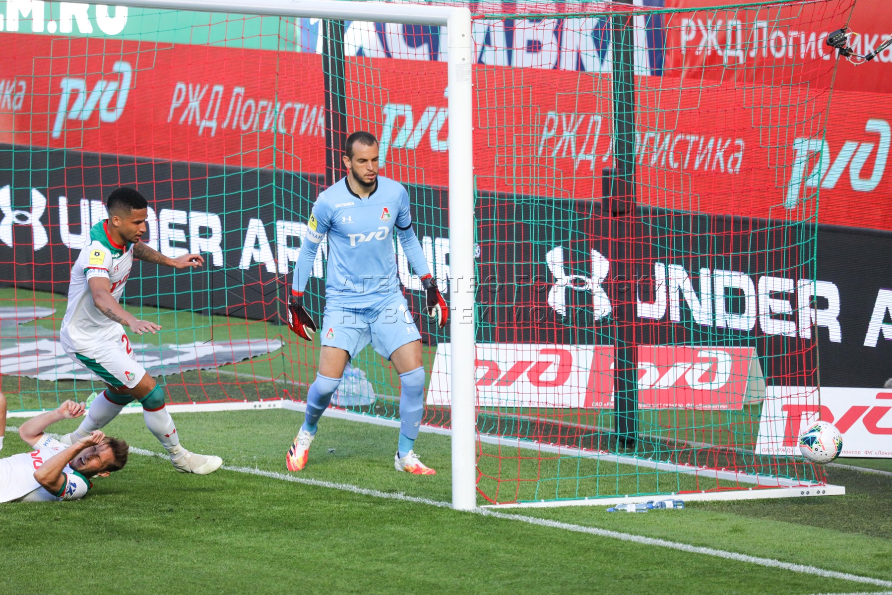 Слева направо - игроки «Локомотива» Мурило и вратарь Маринато Гильерме во время ф...