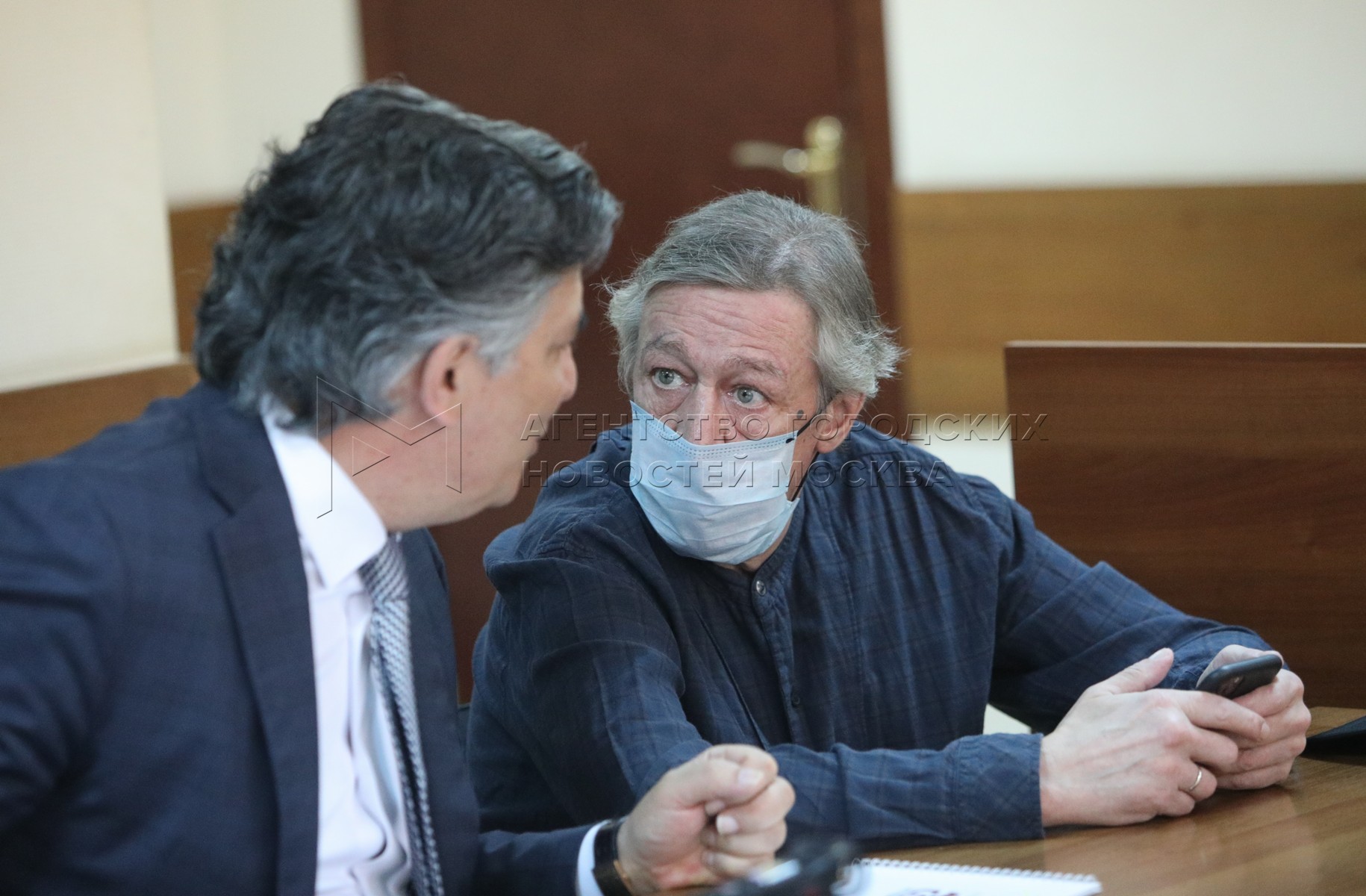 • Описание: Адвокат Эльман Пашаев и актер Михаил Ефремов в Пресненском суде перед рассмотрением по существу дела о ДТП со смертельным исходом.