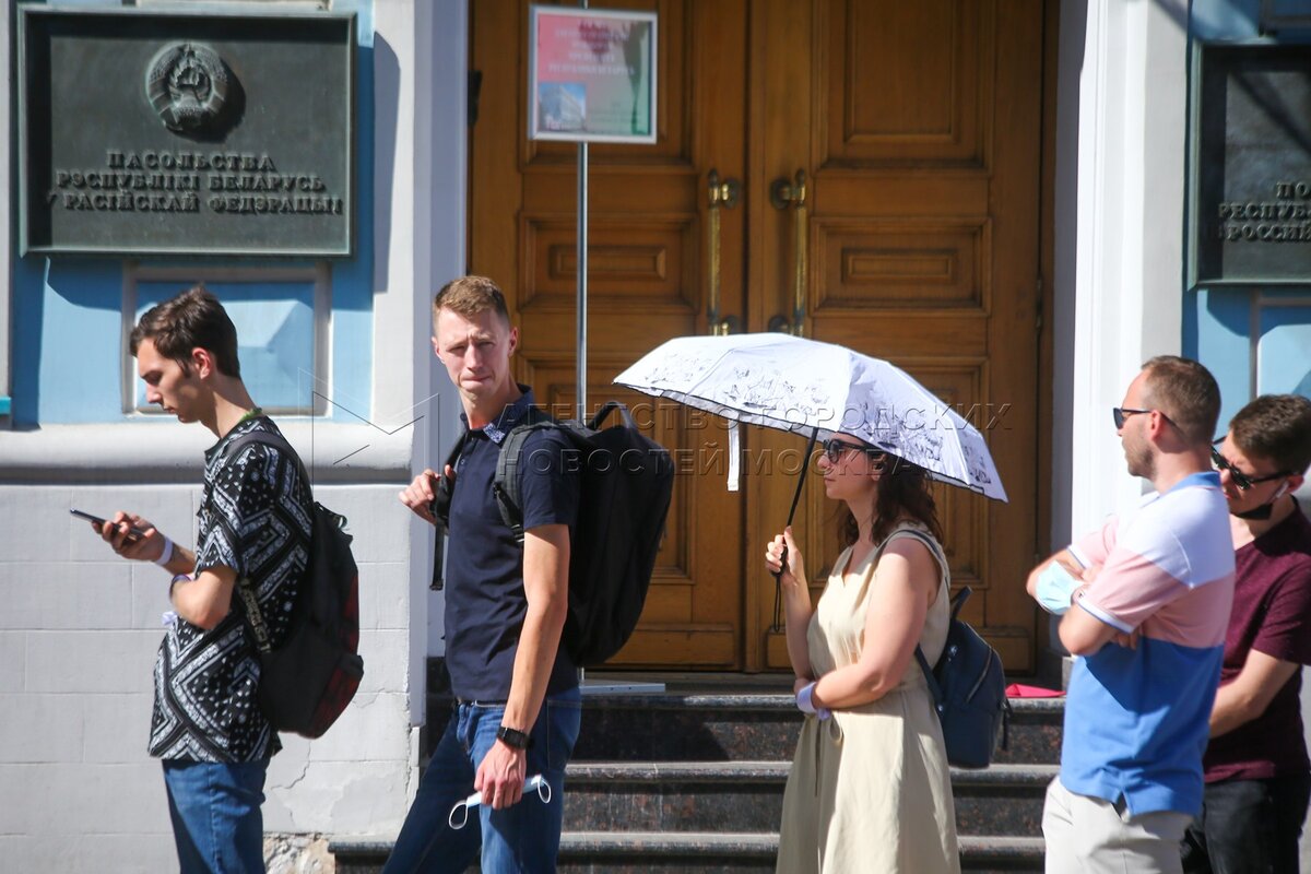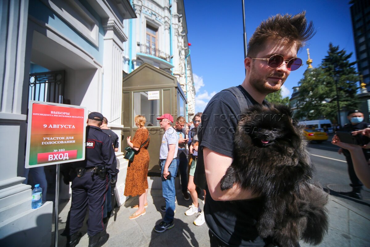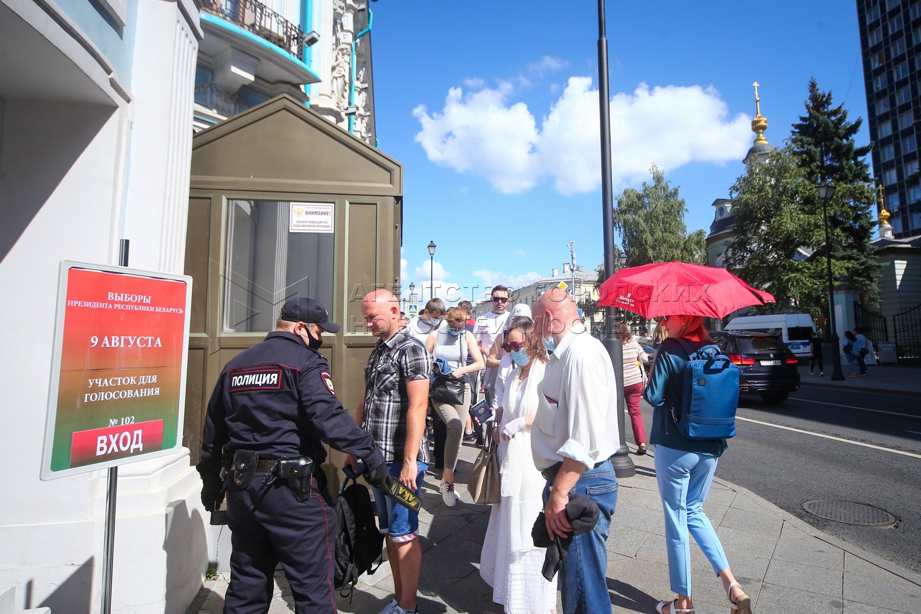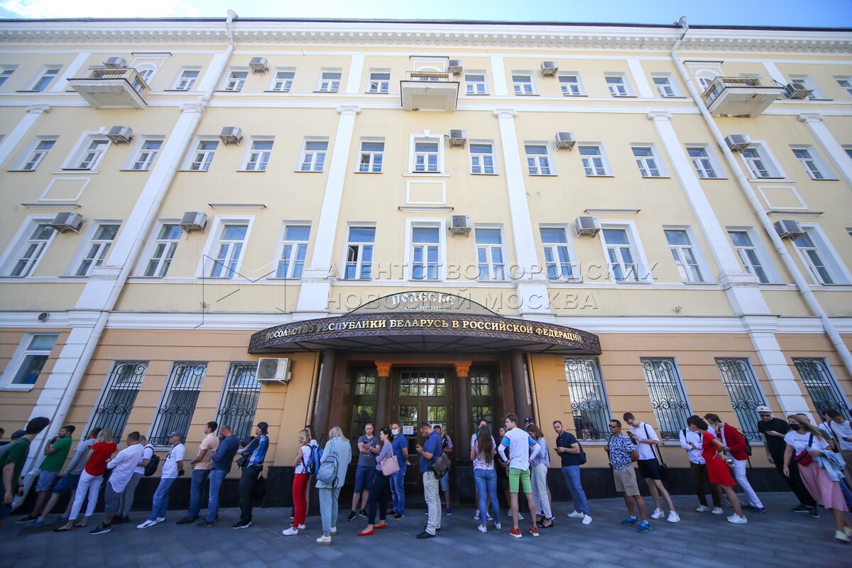 - Заголовок: Очередь у посольства Белоруссии в центре Москвы в основной день выборов президента Белоруссии