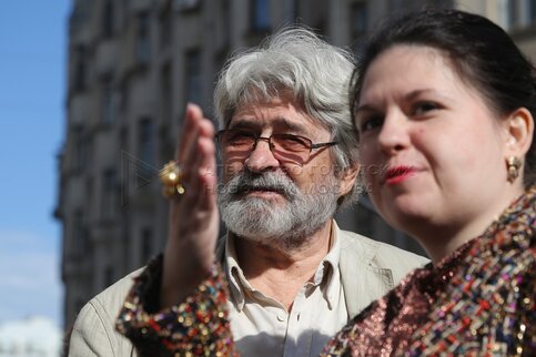 Художник Александр Шилов (слева) во время открытия на ул. Арбат своей выставки по...