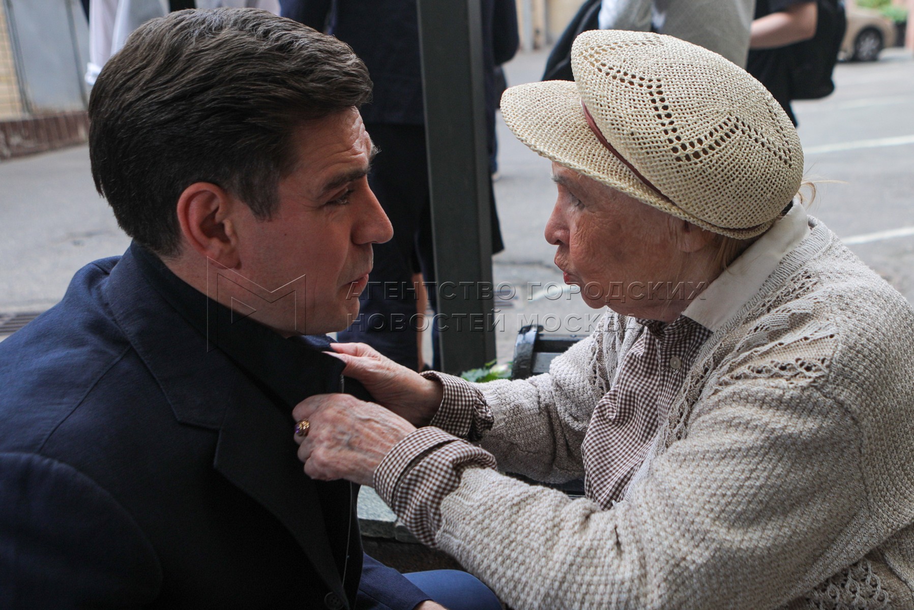 Актеры Дмитрий Дюжев и Нина Гуляева во время сбора труппы Московского художествен...