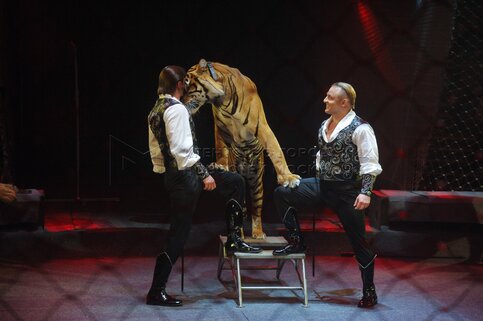 Дрессировщики Аскольд и Эдгар Запашные во время циркового спектакля «И100РИЯ» в Б...