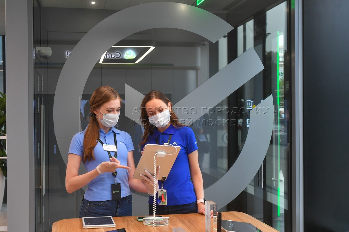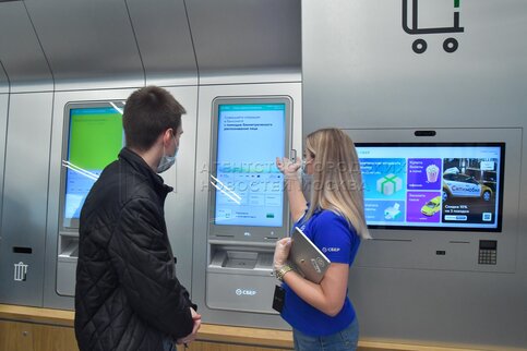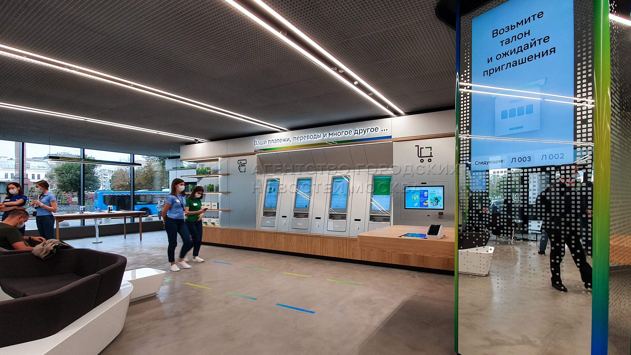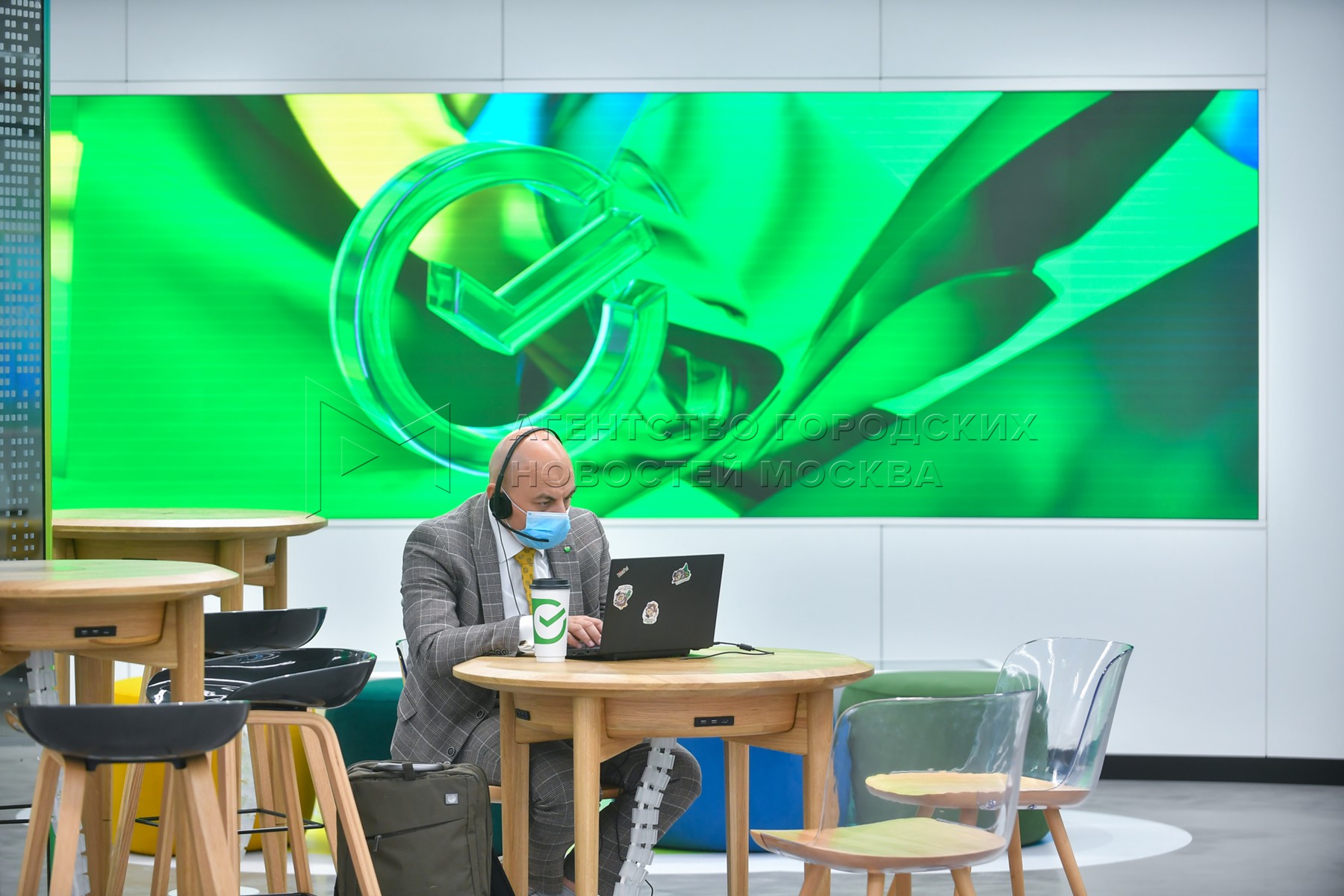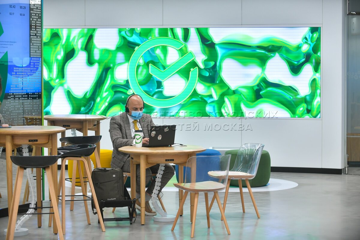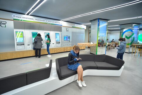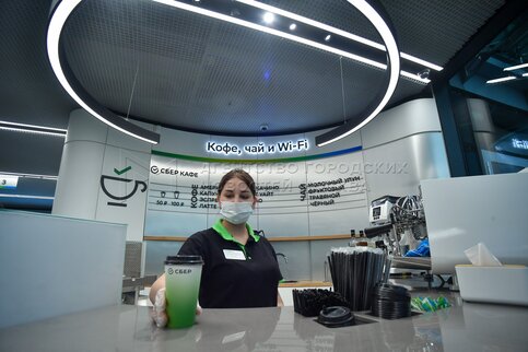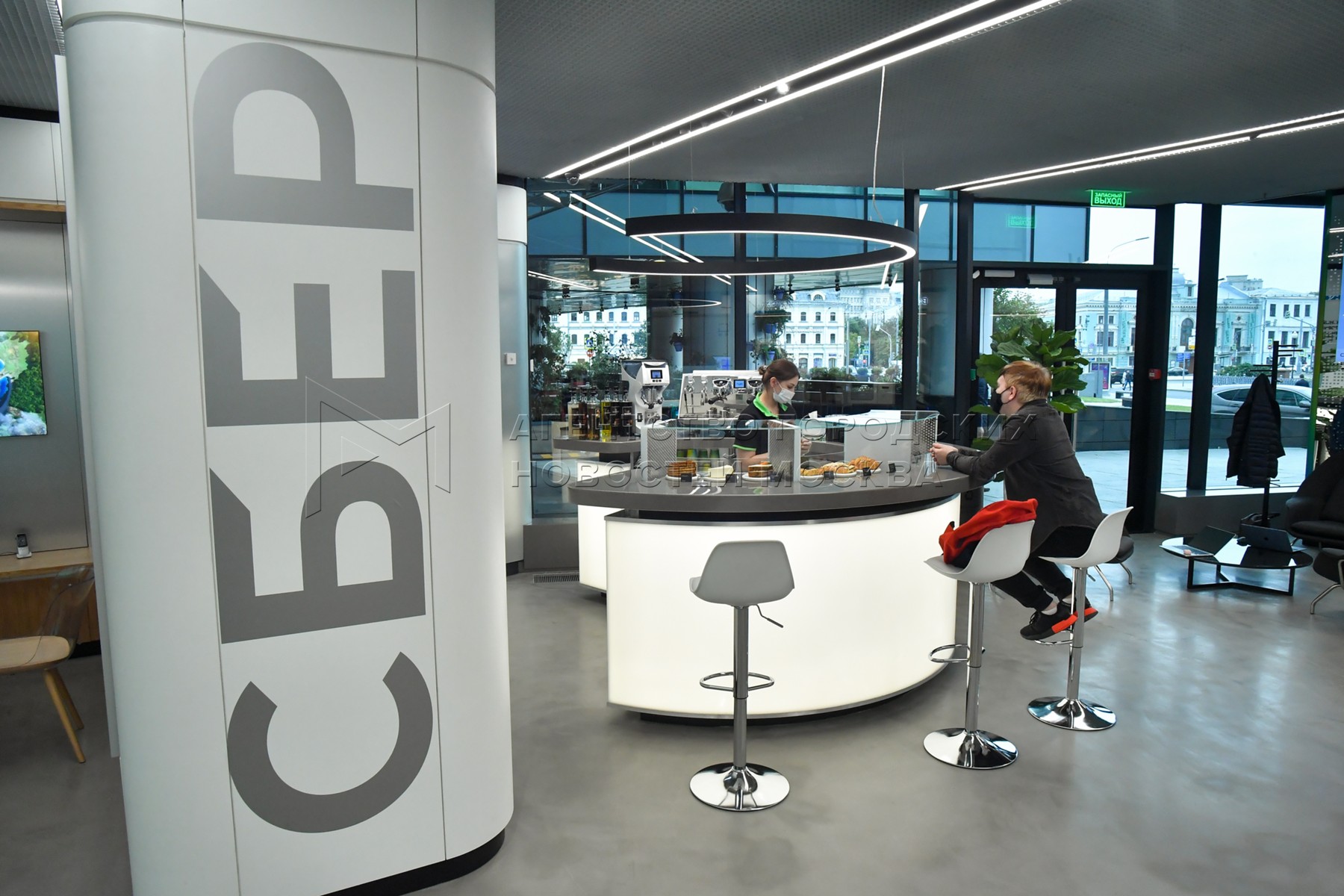 Сотрудница «Сбер кафе» в первом офисе Сбербанка в новом формате, открывшемся на Ц...