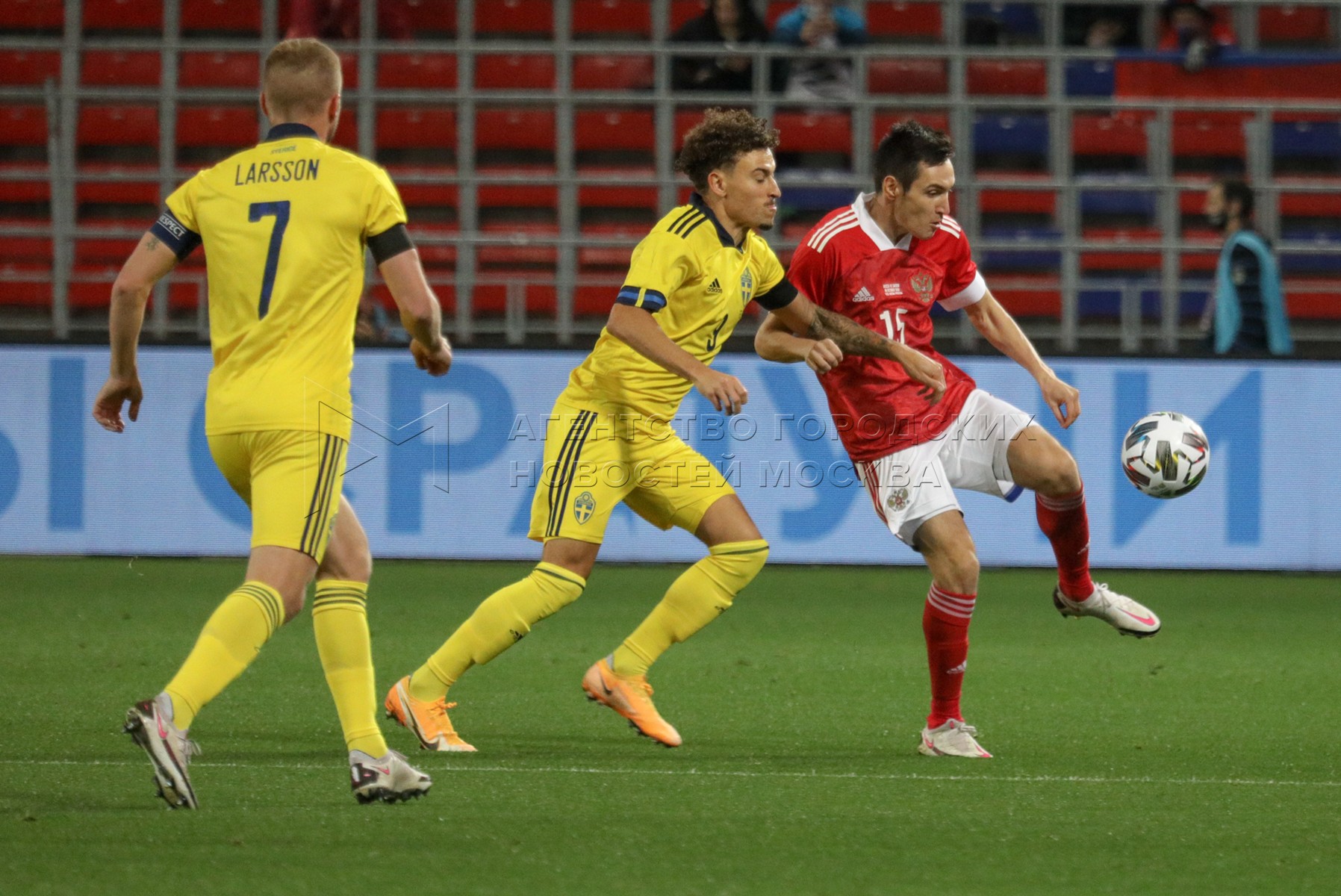 - Описание: Игроки слева направо - Себастьян Ларссон (Швеция), Джордан Ларссон (Швеция) и Вячеслав Караваев (Россия) во время контрольного матча по футболу между национальными сборными России и Швеции на стадионе «ВЭБ Арена».