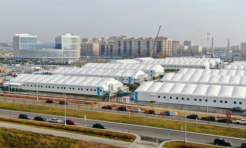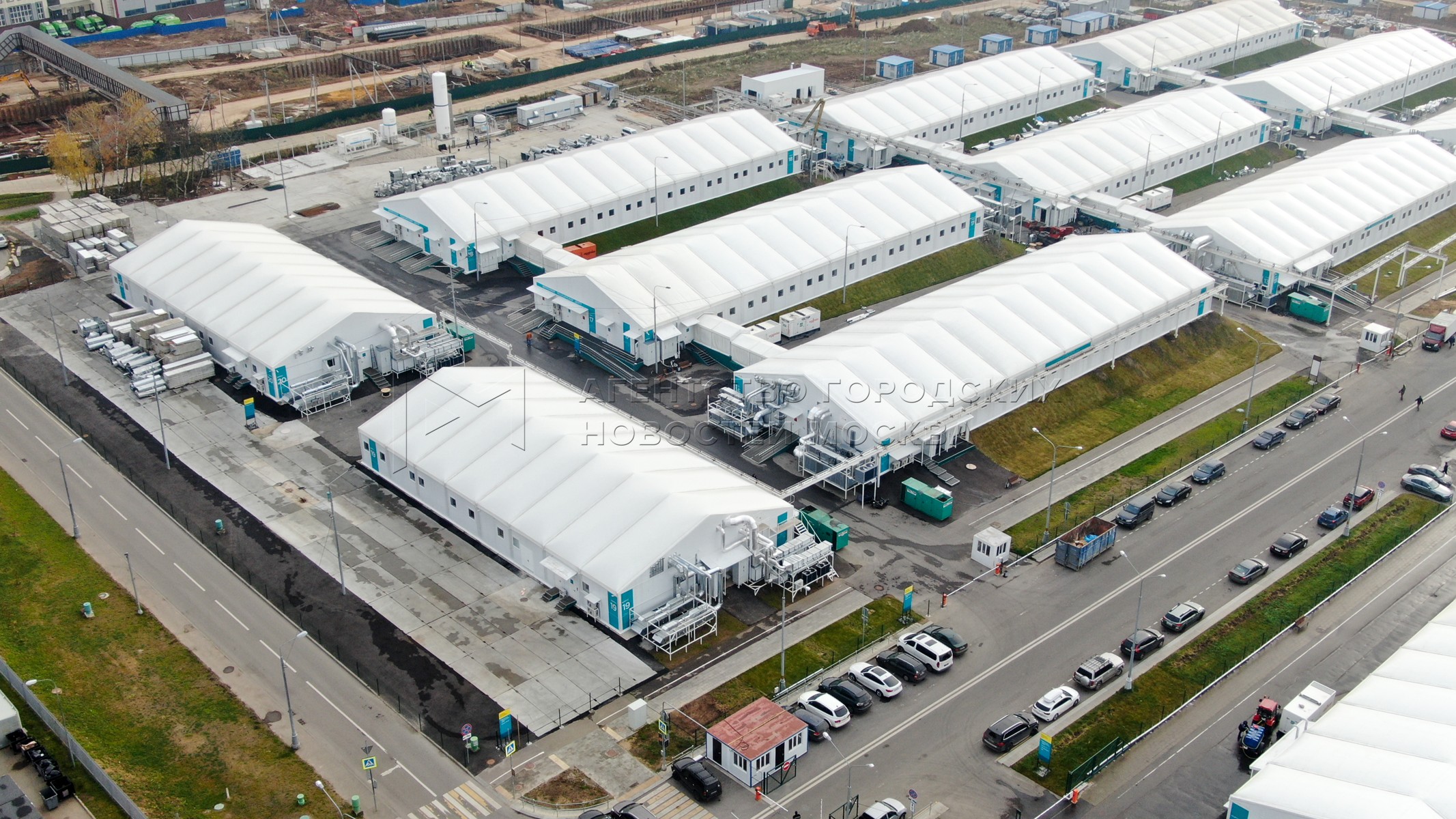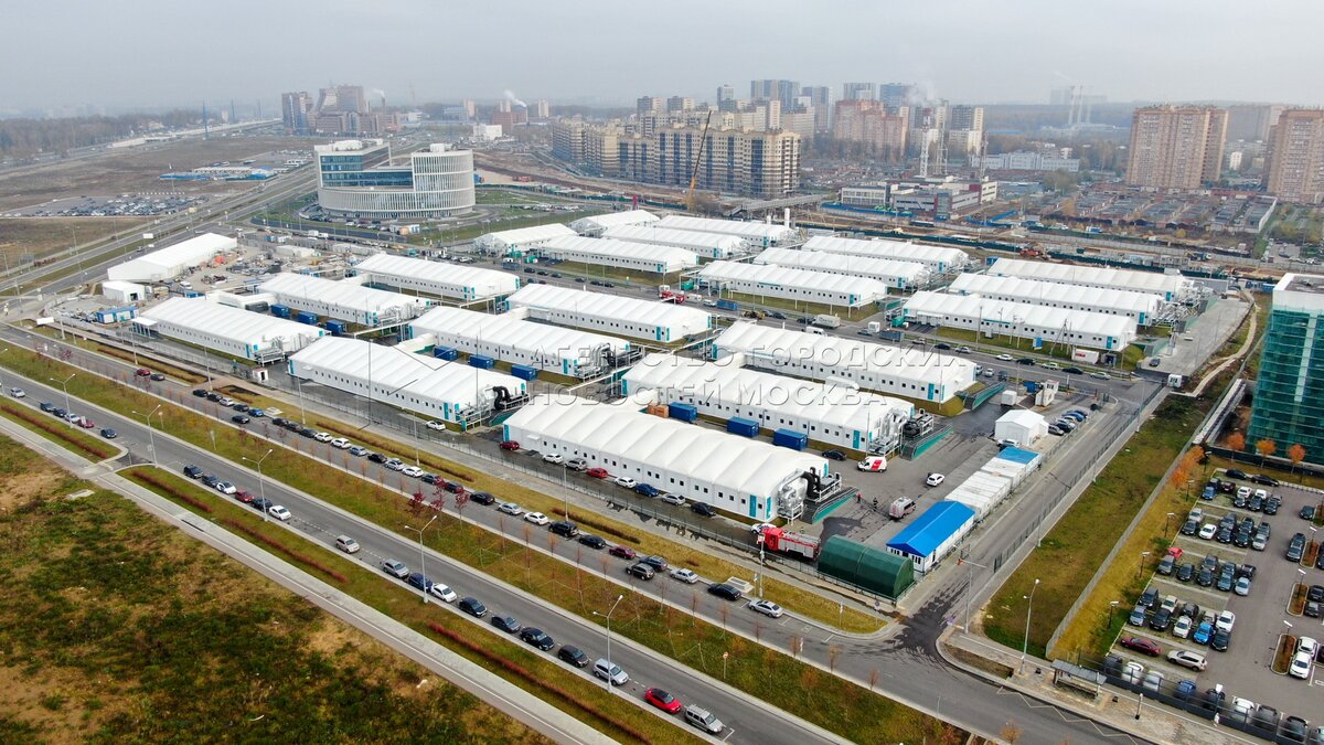 • Описание: Вид с квадрокоптера на резервный коронавирусный госпиталь, развернутый на территории медицинского комплекса в Коммунарке.