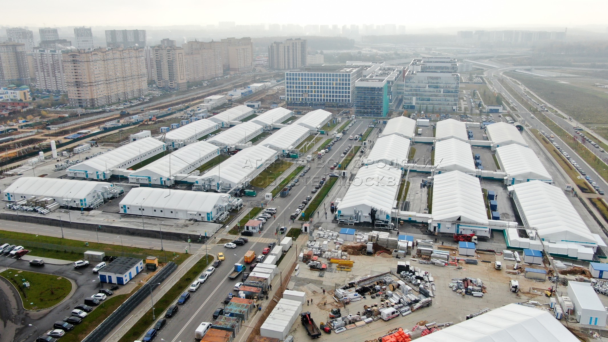 Вид с квадрокоптера на резервный коронавирусный госпиталь, развернутый на террито...